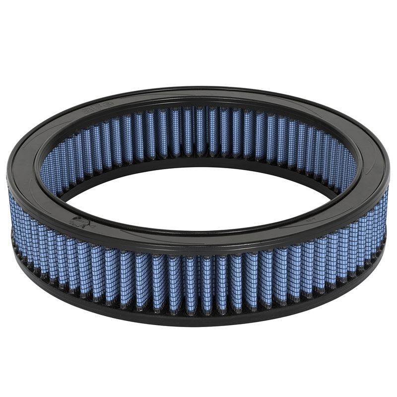 Magnum Flow Pro 5R Round Blue Air Filter (10-10073) by aFe. Constructed with 100% polyurethane on top and bottom, this high flow, oiled OE replacement performance filter will outflow stock paper filter for improved horsepower and torque. Five layers of progressively finer mesh cotton gauze media provide maximum airflow for best performance results. Washable and reusable for multiple cleaning cycles, the tall open evenly spaced pleats provide excellent dust holding capacity for longer service cycle between cleanings. Integrated urethane bump seal insures tight, no leak seal over the life of the filter.