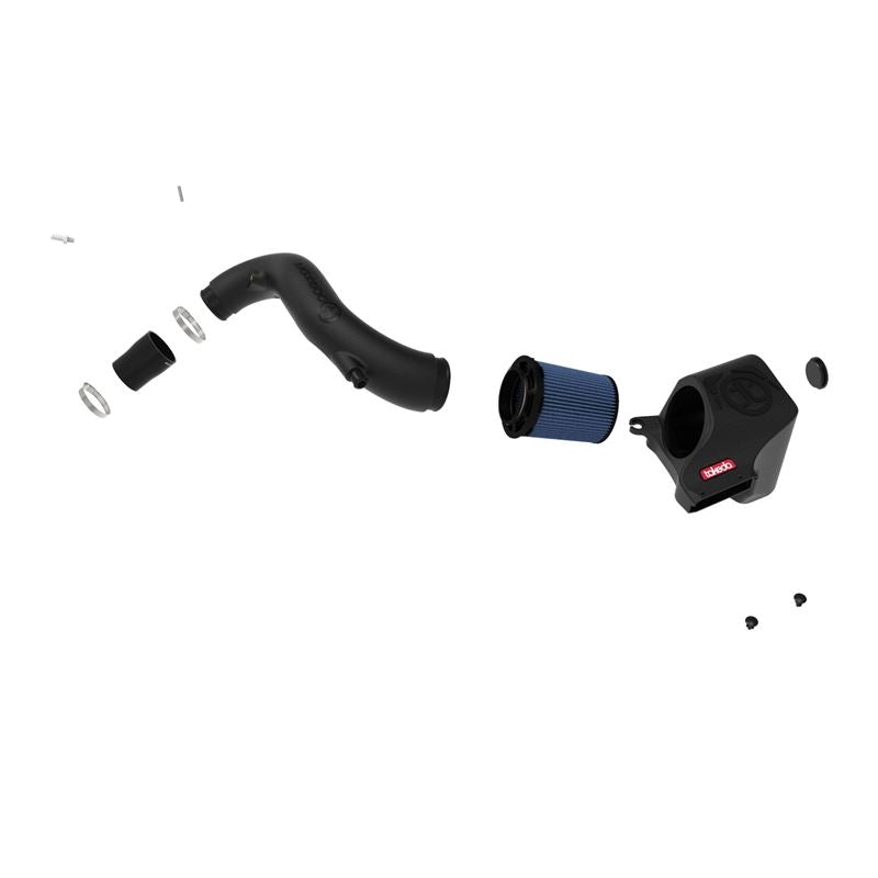 Momentum Black Cold Air Intake System with Pro 5R Filter (56-70005R) by Takeda. With the Momentum Sealed Stage 2 Kit, Takeda has taken Cold Air Intake Systems to the next level. Instead of placing the air filter outside the engine bay, Takeda positions a special Pro DRY S or Pro 5R air filter in a 1-piece combination air box/air scoop, where it can capture cool air forced in from the front of the vehicle. Cooler air contains more oxygen for more complete combustion and more horsepower.