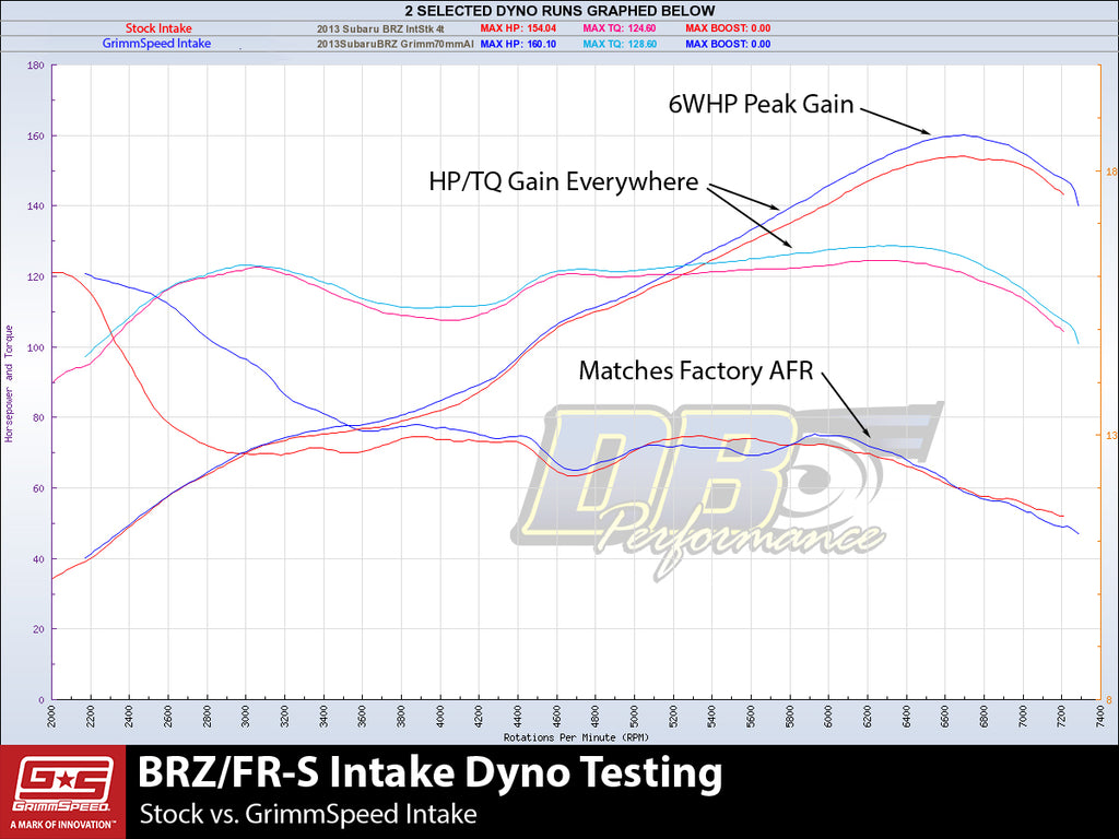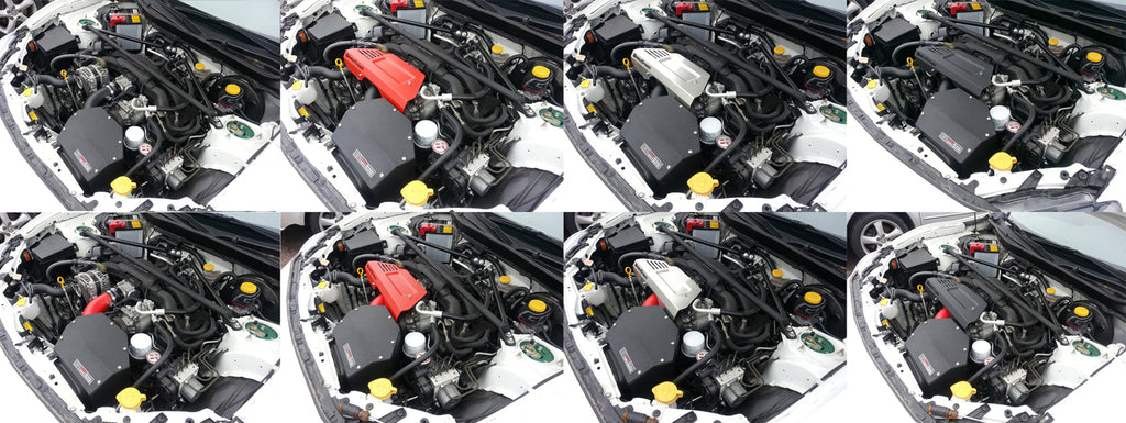 With a solid theoretical foundation and a number of prototypes, our engineers hit the dyno. Working with a very well respected tuner, they tested 26 different intake configurations with over 140 dyno pulls. Armed with a massive amount of data, design decisions were made and we moved forward into production. In true GrimmSpeed fashion, no corners were cut in the fabrication of each and every one of these intakes. The airbox is laser cut, CNC bent, riveted together and threaded inserts are installed before the entire assembly receives a heavy duty black wrinkle powdercoat. MAF flanges are CNC machined from 6061 aluminum and the intake tube is fabricated from custom bent tubing, made specifically for our application, to provide the perfect MAF diameter. The air straightener is laser cut from the same 6061 material and tumbled before the entire assembly is TIG welded by our expert welders. After welding, each tube is inspected and ported as needed to ensure maximum performance. The intake provides gains in horsepower and torque across the entire rev range. This includes gains of 3-4 ftlbs in the "torque dip," and peak gains of 6 horsepower as measured at the wheels on a Dyno Dynamics dynomometer (reads lower than the common Dynojet). These gains are not achieved through MAF trickery either, as the air to fuel ratio remains nearly identical to the factory's. Additional gains in the top end can be achieved by modifying your factory snorkel (around 2whp) as shown.