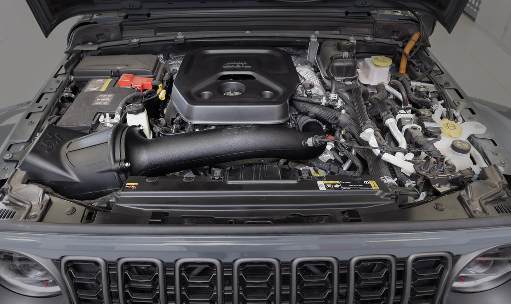 This K&N cold air intake system is engineered for your Jeep Wrangler 4xE L4-2.0L Hybrid. A high-density polyethylene (HDPE) rotationally molded tube helps increase the volume of airflow to your engine and provides a guaranteed increase of 19.24 horsepower and 25.47 torque with no tune required. This intake system is paired with a washable reusable High-Flow LIFETIME Air Filter featuring oiled cotton filter media. The oversized conical design allows you to go up to 100 000 miles between filter services under normal highway driving conditions. A custom designed enclosed air box helps protect intake air from the high temperature of your engine bay and the entire system can typically be installed in less than 60 minutes.