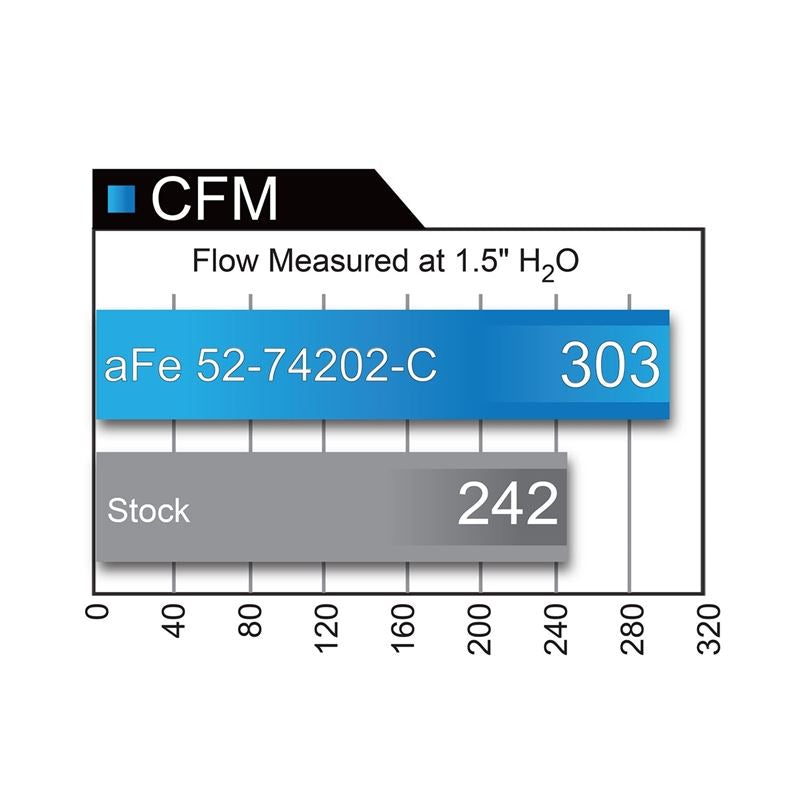 Black Series Momentum Aluminum Black Carbon Fiber Cold Air Intake System with Pro 5R and Pro Dry S Filter (52-74202-C) by aFe. A custom CAD designed roto-molded housing made from heat resistant material eliminates the use of multiple components and ensures the coolest air intake charge available. A large clear sight window allows for filter inspection without removal of the air box. The roto-molded housing is made out of black cross-linked polyethylene. Carbon Fiber Accent are provided for car show quality and to further distinguish your vehicle from others.