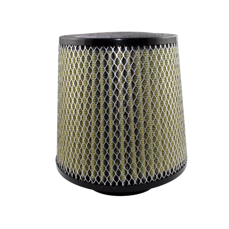 Magnum Flow Pro Guard 7 Round Tapered Tan Air Filter (72-90028) by aFe. This Pro Guard 7 performance air filter outflows the factory intake by 44%. The Inverted? design of this unique OE replacement filter fully utilized the space in the stock air box to provide the most filter media of any drop-in? OE replacement filter. With seven layers of progressively finer mesh cotton gauze/synthetic media, this high flow oiled? OE replacement performance filter provide maximum protection with highest cumulative filtration efficiency for severe duty environments. Washable and reusable for multiple cleanings, the tall open evenly spaced pleats provide excellent dust holding capacity for longer service cycle between cleanings. Integrated urethane bump seal insures tight, no leak seal over the life of the filter.