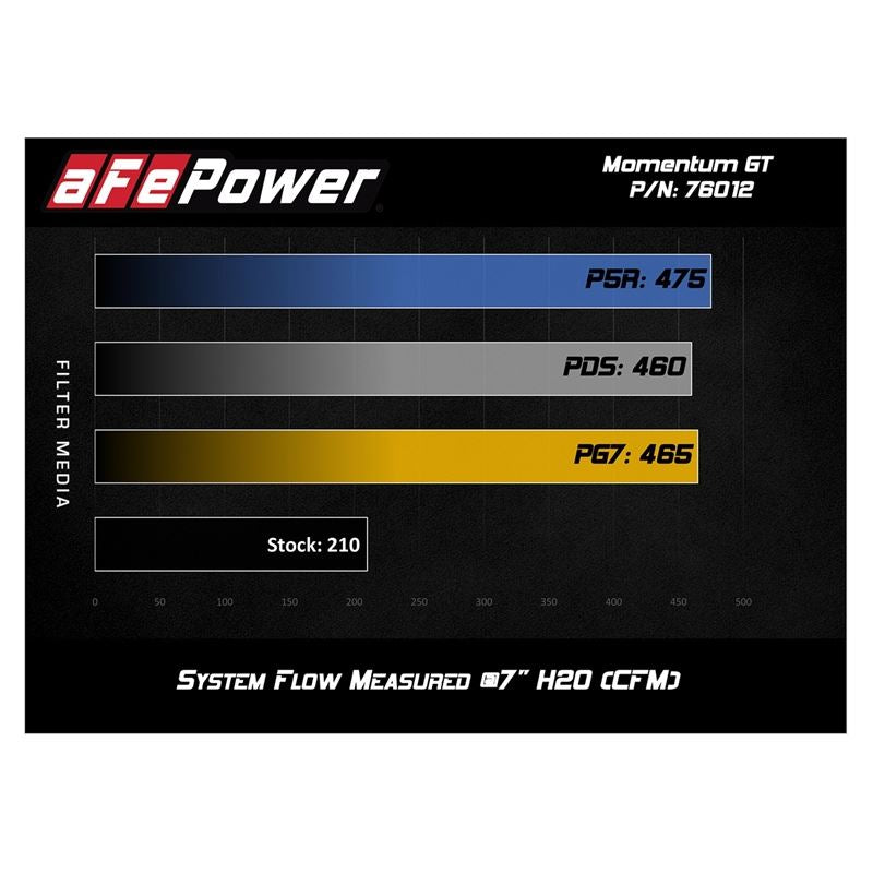 Momentum GT Plastic Black Cold Air Intake System with Pro Dry S Filter (51-76012) by aFe. A custom CAD designed roto-molded housing made from heat resistant material eliminates the use of multiple components and ensures the coolest air intake charge available. A large clear sight window allows for filter inspection without removal of the air box. The roto-molded housing is made out of black cross-linked polyethylene. Carbon Fiber Accent are provided for car show quality and to further distinguish your vehicle from others.