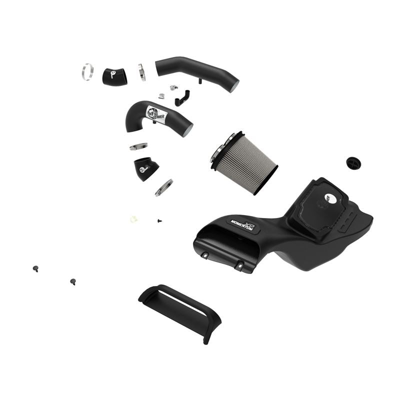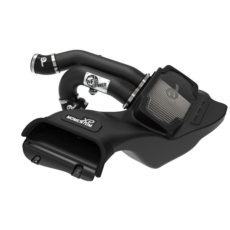 Momentum's unique filter-to-housing interface was built to feature the largest air filter possible. This 9" tall 360-degree radial flow air filter features two 3" inlets and our oil-free Pro DRY S media with three layers of synthetic media for maximum convenience. Its progressive layering provides great filtration efficiency and dust holding capacity, while not requiring the use of oils. This media is best suited for street use. Its inverted top makes for more filter surface area, resulting in longer service intervals. This media is best suited for street and light off-road use. The smooth one-piece sealed housing, constructed of heat-resistant cross-linked polyethylene (XLPE), features our patent-pending filter-to-housing interface. Its innovative design minimizes the total number of parts, making for an easy installation. A large, clear sight window allows for hassle-free filter inspection, without having to disassemble your system. The housing incorporates the factory air inlet scoop. Dual mandrel-bent wrinkle-black powder-coated aluminum intake tubes direct unrestricted airflow from the filter to the turbos for more horsepower and torque. A hose connects both tubes to balance air intake pressure. A silicone seal piece finishes the inlet of the housing and seals to the hood to block off unwanted hot engine air from entering the air intake system. Premium stainless-steel worm-gear clamps provide the best corrosion resistance possible and premium silicone couplings allows for ample flexibility and guarantee perfect seals. Momentum XP intakes are designed with fewer parts for a quick and simple installation.
