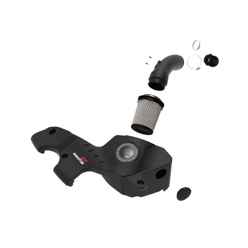 Momentum GT Cold Air Intake System w/ Pro DRY S Media.This 6-1/2" tall 360-degree radial flow air filter features a 3-1/2" round flange and our oil-free Pro DRY S media with three layers of synthetic media for maximum convenience. Its progressive layering provides great filtration efficiency and dust holding capacity, while not requiring the use of oils. This media is best suited for street and light off-road use. The smooth one-piece sealed housing, constructed of heat-resistant XLPE (cross-linked polyethylene) polymer, features our patent-pending filter-to-housing interface. A large, clear sight window allows for hassle-free filter inspection, without having to disassemble your system. This system features a high quality, computer-designed, dyno-tuned intake tube to achieve maximum power gains while maintaining a perfect fit. Its XLPE material is heat-soak resistant and extremely durable. This intake is designed to use factory mounting locations, minimizing the use of unnecessary hardware, ensuring a perfect fit every time. Its revolutionary design, featuring our patent pending filter-to-housing interface uses half the number of parts of a traditional cold air intake system. Stainless-steel worm clamps are included for strength, and a premium bellows coupling allows for ample flexibility.