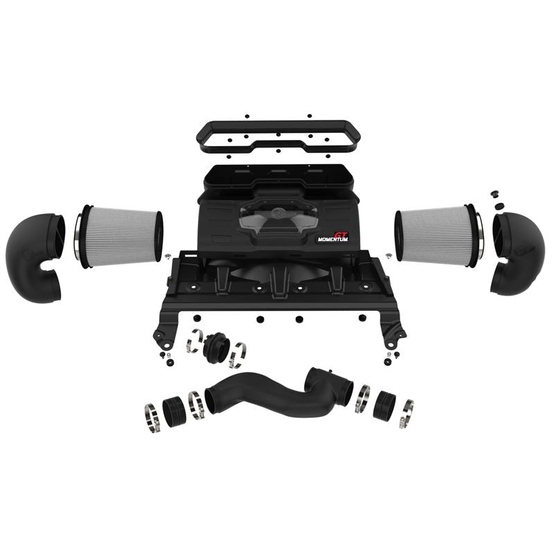 Momentum GT Cold Air Intake System w/ Pro DRY S Media.A pair of 360-degree radial flow air filters feature our oil-free Pro DRY S media with three layers of synthetic media for maximum convenience. The progressive layering provides great filtration efficiency and dust holding capacity, while not requiring the use of oils. This media is best suited for street and light off-road use. The inverted tops makes for more filter surface area, resulting in longer service intervals. Momentum's innovative filter-to-housing interface was built to feature the largest air filter possible. Once the system is installed, the air filters can be easily removed from the housing for maintenance by only uninstalling the side intake tubes. The smooth one-piece sealed housing, constructed of heat-resistant cross-linked polyethylene (XLPE), features our patent pending filter-to-housing interface. Its innovative design minimizes the total number of parts, making for an easy installation. A massive clear sight window allows for hassle-free filter inspection without having to disassemble your intake system. The housing incorporates both the factory hood air inlet scoop and the grille inlet using no additional hardware. This system features a trio of high quality, computer-designed, dyno-tuned intake tubes to achieve maximum power gains while maintaining a perfect fit. Our XLPE material is heat soak resistant and extremely durable. Stainless-steel T-bolt clamps are included for strength, and a premium silicone coupling allows for ample flexibility and durability. Momentum GT intakes are designed with fewer parts for a fast and easy installation.