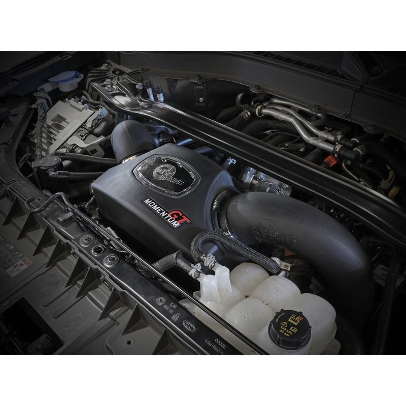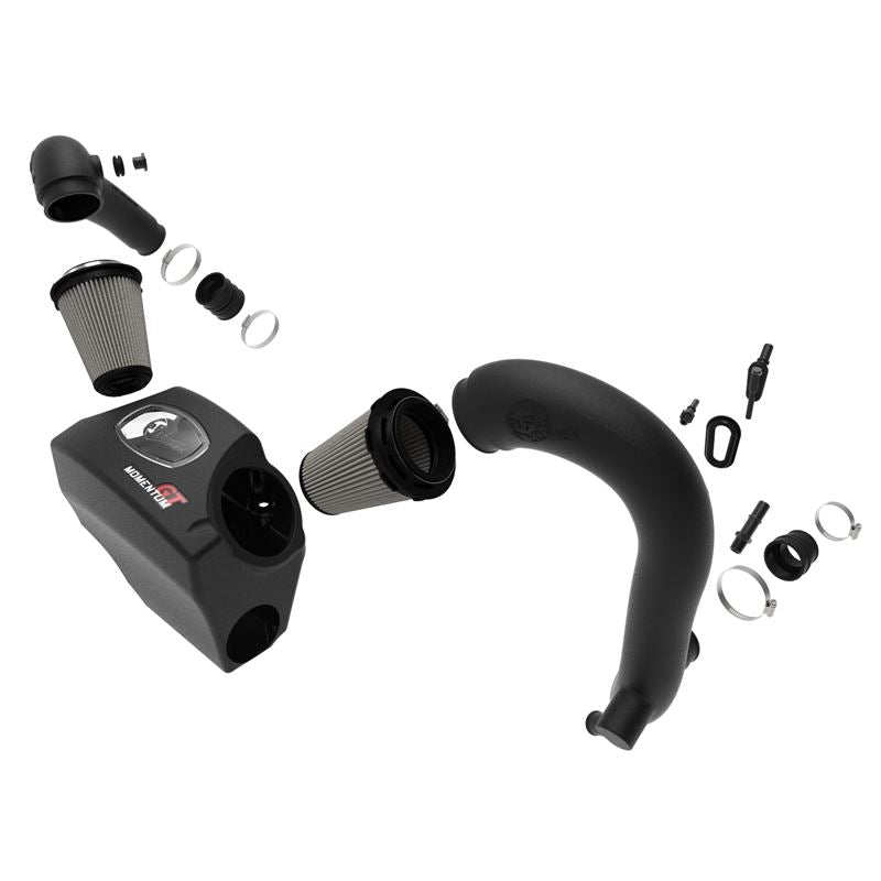 Momentum GT Cold Air Intake System w/ Pro DRY S Media.These 6" tall 360-degree radial flow air filters feature a 3.5" flange and our oil-free Pro DRY S media with three layers of synthetic media for maximum convenience. Their progressive layering provides great filtration efficiency and dust holding capacity, while not requiring the use of oils. Their inverted top makes for more filter surface area, resulting in longer service intervals. This media is best suited for street use. Momentum's innovative filter-to-housing interface was built to feature the largest air filter possible. Once the system is installed, the air filter can be easily removed from the housing for maintenance by uninstalling the intake tube. The smooth one-piece sealed housing, constructed of heat-resistant cross-linked polyethylene (XLPE), features our patent-pending filter-to-housing interface. Its innovative design minimizes the total number of parts, making for an easy installation. A large, clear sight window allows for hassle-free filter inspection, without having to disassemble your system. The housing incorporates the factory air inlet scoop, using no additional hardware. This system features high quality, computer-designed, dyno-tuned intake tubes to achieve maximum power gains while maintaining a perfect fit. Its XLPE material is heat soak resistant and extremely durable. Stainless-steel clamps are included for strength, and premium silicone couplings are used for durability while also providing the most secure installation available. Aluminum and Nylon vacuum fitting are included for a perfect fit and finish. Momentum GT intakes are designed with fewer parts for a fast and easy installation.