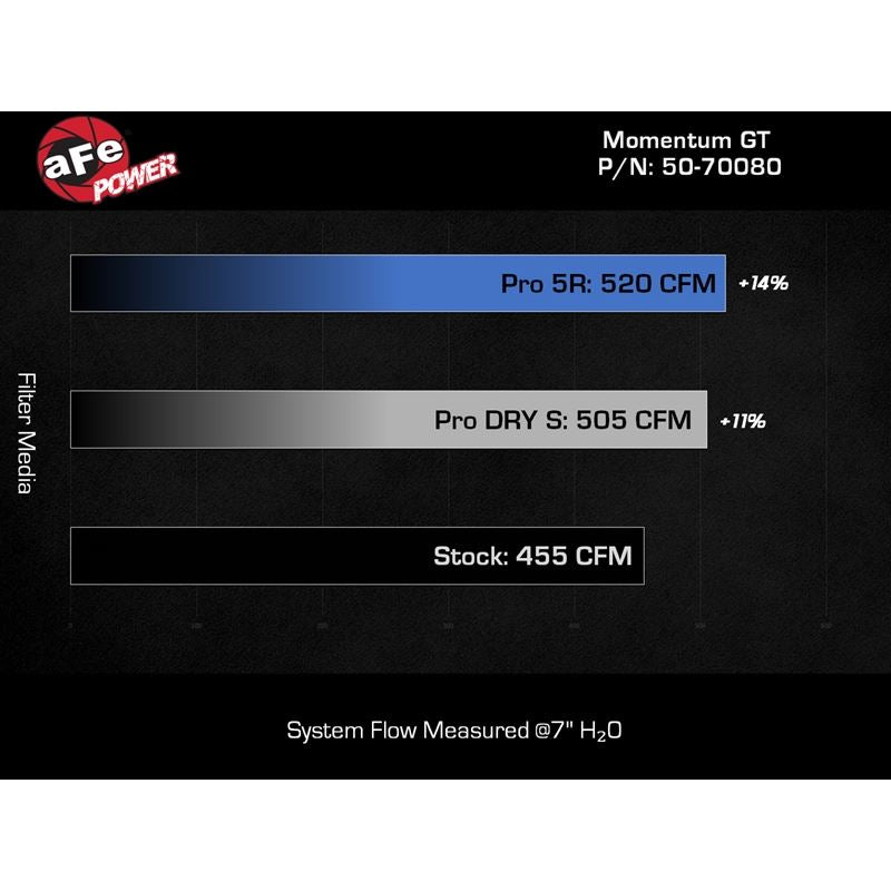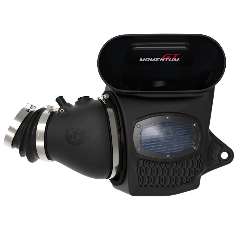 Momentum GT Cold Air Intake System w/ Pro 5R Media.Momentum's unique filter-to-housing interface was built to feature the largest air filter possible. This 8" tall, pre-oiled 360-degree radial flow air filter features our pre-oiled Pro 5R media with five layers of progressively finer cotton gauze media for maximum performance and filtration. Its inverted top and large surface area provide much longer life between maintenance intervals. The smooth one-piece sealed housing, constructed of heat-resistant cross-linked polyethylene (XLPE), features our patent-pending filter-to-housing interface. Its innovative design minimizes the total number of parts, making for an easy installation. A large, clear sight window allows for hassle-free filter inspection, without having to disassemble your system. The housing utilizes the factory hood scoop and retains the water separating functionality. This system features a high quality, computer-designed, dyno-tuned intake tube to achieve maximum power gains while maintaining a perfect fit. Its XLPE material is heat soak resistant and extremely durable. Premium stainless-steel T-bolt clamps are used for durability and provide the best corrosion resistance possible. Momentum GT intakes are designed with fewer parts for a quick and simple installation.