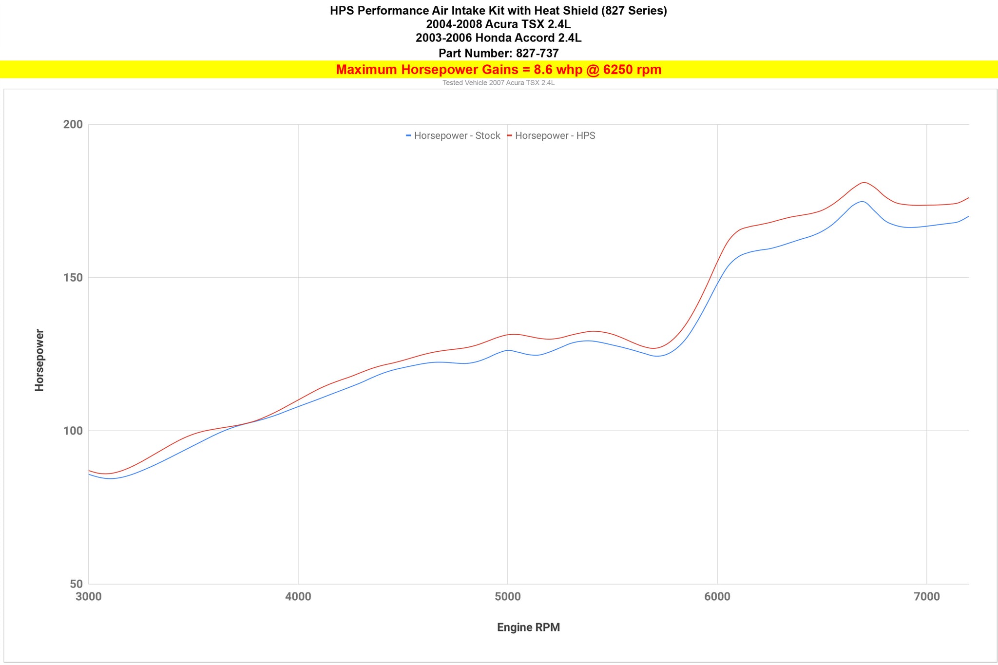 Designed with performance in mind, this HPS Performance Air Intake Kit replaces your restrictive stock intake tubing and air cleaner with a custom made 2.75" mandrel-bent aluminum intake tube. A reusable high-flow cotton air filter is incorporated in the design to deliver maximum power gains. The specially designed heat shield prevents radiant heat from entering the engine while at the same time allowing the enhanced induction sound to be heard upon acceleration. HPS air intake kits feature high performance hardware such as durable HPS 3-ply silicone couplers and stainless steel T-bolt clamps that are engineered to perform under toughest driving conditions. Experience faster 0-60 times with dyno proven gains of up to 8.6 horsepower and 7.3 lb-ft of torque.