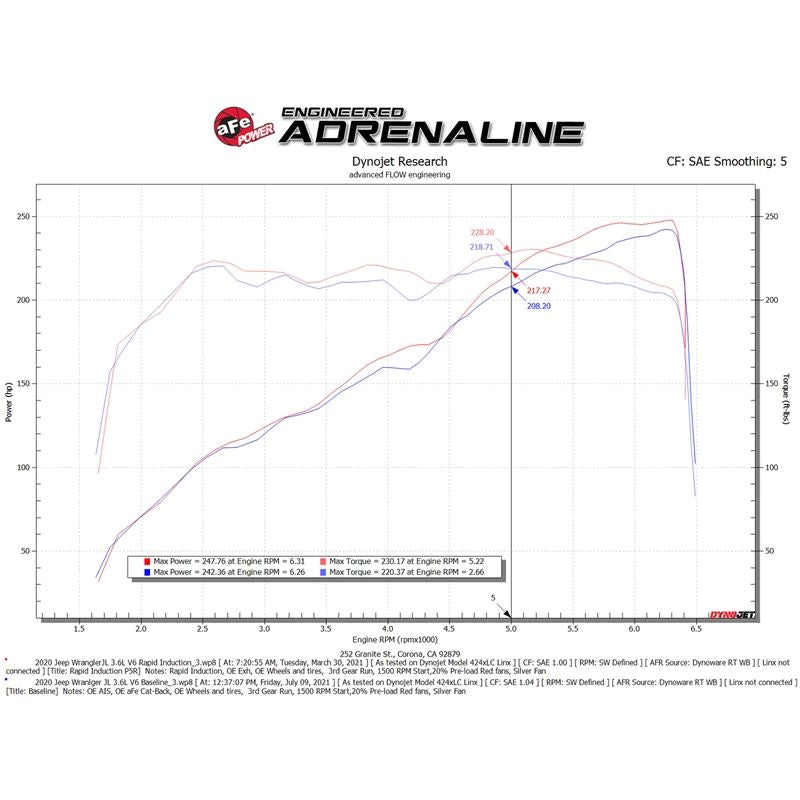 Rapid Induction Cold Air Intake System w/ Pro 5R Media.This filter features three layers of oil-free synthetic media and requires no oil during maintenance to provide maximum convenience. Its progressive layering provides great filtration efficiency and dust holding capacity. This media is best suited for street use. Pro DRY S filters are easily recharged with aFe's POWER CLEANER. aFe developed this sturdy 18 gauge steel wrinkle-black powder-coated heat shield to snap onto the top of the lower half of the factory airbox to provide a hassle-free installation utilizing factory mounting locations. The retention groove on the filter base locks the filter onto the heat shield without any additional hardware. This system features a high quality, computer-designed, dyno-tuned intake tube to achieve maximum power gains while maintaining a perfect fit. Its XLPE material is heat soak resistant and extremely durable. The integrated slotted mounting tabs secure the tube to the radiator shroud and allow for engine movement while off-roading. Stainless-steel worm clamps and silicone couplings are used for strength and durability.