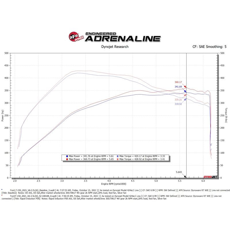 Rapid Induction Cold Air Intake System w/ Pro 5R Media.This 5-3/4" tall 360-degree radial flow air filter features a 5-1/2" flange and our pre-oiled Pro 5R media with five layers of progressively finer cotton gauze media for maximum performance. It provides your engine with the largest amount of high-flowing air and delivers the highest power gains in most cases. This media is perfect for street and/or track use. Its inverted top makes for more filter surface area, resulting in longer service intervals. aFe POWER developed this heat shield to snap onto the top of the lower half of the factory air box to provide a hassle-free installation utilizing factory mounting locations. This system features a high quality, computer-designed, dyno-tuned intake tube to achieve maximum power gains while maintaining a perfect fit. Its XLPE (cross-linked polyethylene) material is heat soak resistant and extremely durable. The computer designed system utilizes factory mounting locations, minimizing the use of unnecessary hardware, and ensuring a perfect fit every time. This is a direct bolt-on kit that requires no cutting or drilling on factory parts. Stainless-steel clamps are included for strength, and premium silicone couplings allow for ample flexibility This air intake system works perfectly in combination with aFe POWER D.A.S. (Dynamic Air Scoop): 52-10010S(Black), 52-10010SR(Red) and 52-10010SL(Blue).