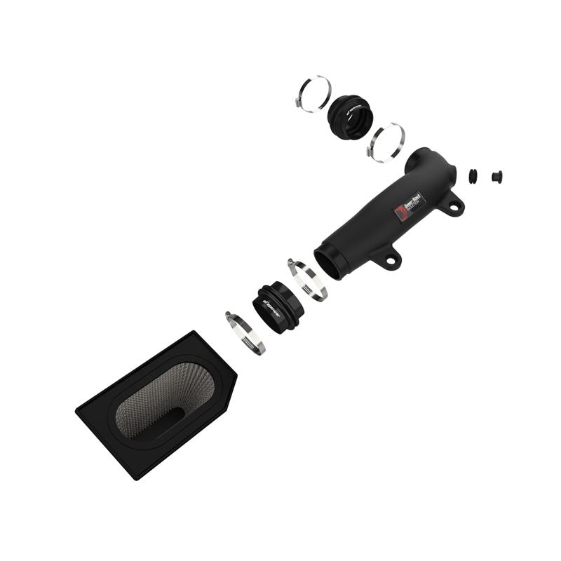 Super Stock Induction System w/ Pro DRY S Media.This filter features three layers of oil-free synthetic media and requires no oil during maintenance to provide maximum convenience. Its progressive layering provides great filtration efficiency and dust holding capacity. This media is best suited for street use. Pro DRY S filters are easily recharged with aFe's POWER CLEANER. The unique IRF (Inverted Replacement Filter) design utilizes the depth of the OE airbox, providing maximum surface area, airflow, and performance, all within the stock filter housing. This system features a high quality, computer-designed, dyno-tuned intake tube to achieve maximum power gains while maintaining a perfect fit. Its XLPE material is heat soak resistant and extremely durable. Stainless-steel worm clamps and silicone couplings are used for strength and durability.