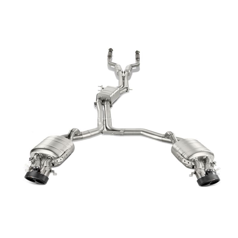 Audi's high-performance RS models are an ideal match for the expertly styled and beautifully engineered Akrapovic Evolution exhaust systems. The Evolution gives more power, higher torque, decreases the weight, and delivers an unmistakable Akrapovic sound-which has a deep sound at lower revs and a 'popping' sound as things speed up when the throttle is lifted. This titanium exhaust system has cast collectors and three mufflers, with the central one featuring an x-piece inside, which increase power and improve its sound. The valves of the system are designed to open and close in line with the RS' standard electronics, and the whole system has carbon-fibre tailpipes to show off the exquisite finish of the Akrapovic exhaust. Its easy-to-fit instructions are included, and with this cat-back performance exhaust system-which means that the stock catalytic converters remain in place-there's no need to remap the ECU (it's simply a plug-and play system). The high-performance exhaust by Akrapovic gives you absolute freedom to customize your vehicle to make it perform and sound at its best. This product will significantly improve your performance and deliver a superior driving experience you've been looking for.