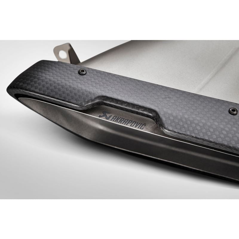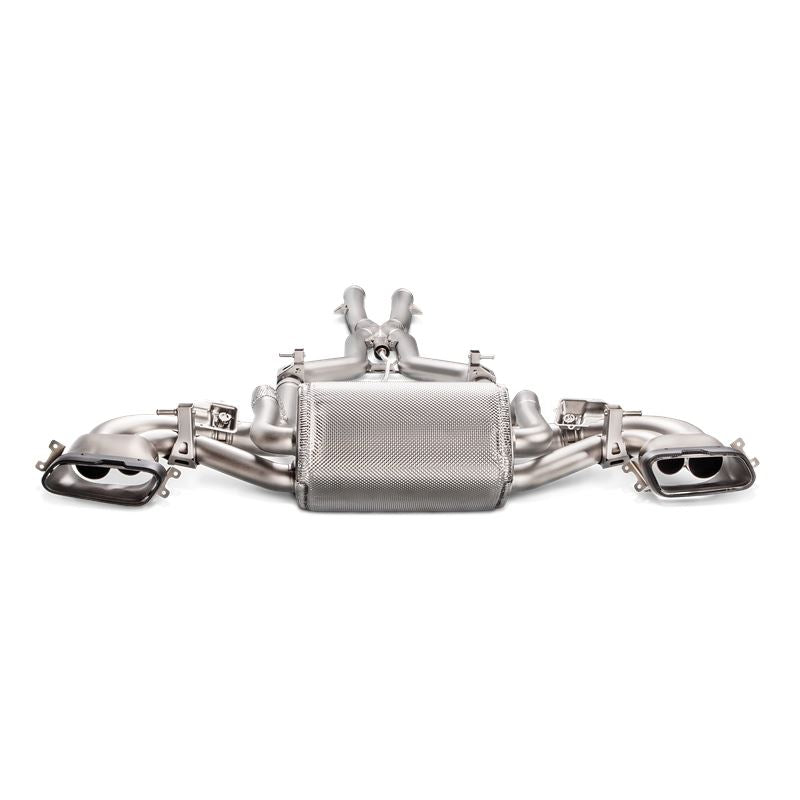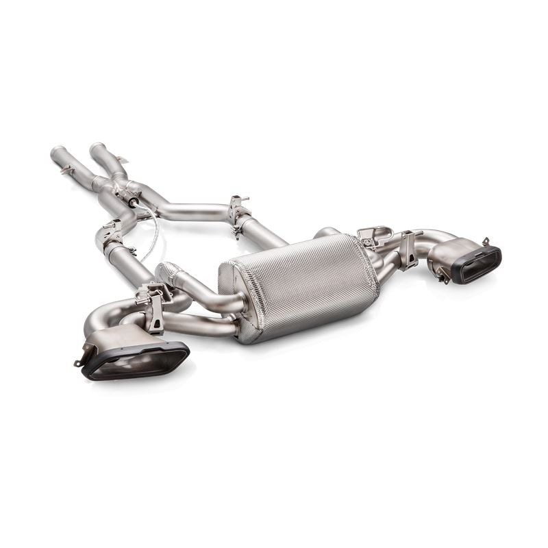 The Evolution Line (Titanium) takes these cars to heightened levels of auditory excitement, enhanced performance, and stunning good looks, all with a perfectly sculpted exhaust made from ultra-lightweight titanium alloys that reduce the weight from the stock exhaust by over 46%. Finished with hand-crafted carbon-fibre tailpipes, this exhaust has a stunning soundtrack and that unique Akrapovic signature. The sound is controlled by a complex X-connection, cast in the in-house titanium foundry, with a precisely machined valve flap to alter the tones, which can be controlled with a console button inside the cabin or by the Sound Remote Controller of the optional Akrapovic Sound Kit. When the X-connection valve is open, the exhaust system delivers a more continuous, smooth, and harmonic sound for a more comfortable ride, and in closed mode the acoustics have been maximised to give the cars a pure sporty and intense muscle-car V8 roar. Power and torque levels are increased throughout the entire rev range. It is ECE approved, so no re-map or other parts are needed and it is a simple plug-and-play installation.