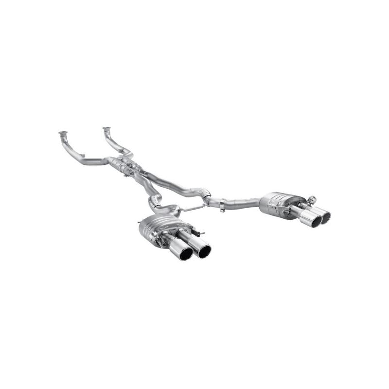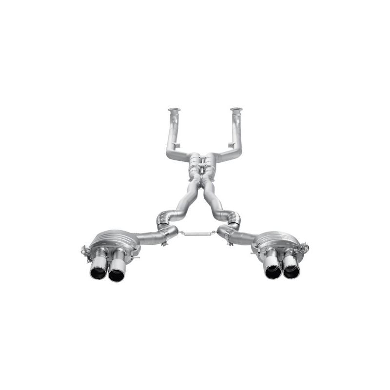 Evolution Line Titanium Exhaust System with Quad Rear Exit (ME-BM/T/6H-C) by Akrapovic. With Tips. Exhaust Tubing Material: Titanium. Exhaust System Sound: Aggressive / Loud. The Evolution exhaust system made of Akrapovic proprietary titanium consists of newly developed dual-outlet mufflers with exhaust valves, flow-optimized pipes, and a unique cast titanium X-shaped part with resonators. Back pressure is lowered and the vehicle benefits from more power throughout the entire range of rpms. It increases responsiveness and an improved power-to-weight ratio has been achieved without removing the catalytic converters. The Evolution performance exhaust offers a deep sporty sound, growing to an aggressive roar when driven hard but without droning.