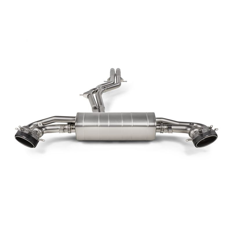 This beautifully formed exhaust has sound and performance running right through it. Constructed entirely from low-weight, high-grade titanium, it features a central muffler flanked by two valves (the housings of both valves are cast at the in-house Akrapovic foundry) and a link pipe set with an X-connection element. With unique sound patterns designed to offer maximum enjoyment, the X-connection in the link pipe section gives the exhaust system a characteristic Akrapovic high-frequency racing tone in the upper rev range, which is complemented by the deep and iconic Akrapovic rumble from low down in the rev range, providing a distinctive V8 growl. There also is a comfort mode, with no unwanted noise or drone in the cabin. Finished with eye-catching carbon-fibre / titanium tailpipes exiting on either side of the rear of the car, the exhaust also increases power by 6.9 kW at 5,600 rpm and adds 17.2 Nm of torque at 2,500 rpm when tested on Akrapovic's in-house dyno in back-to-back runs with RS Q8 against the stock RS Sport exhaust system. It is a plug-and-play product, and due to its ECE type approval there is no need to tune the ECU. An optional Akrapovic Sound Kit and Downpipe / Link pipe set (SS) is available to upgrade the Evolution Line (Titanium) exhaust. With the installation of the Downpipe / Link pipe set (SS), ECE type approval for the Evolution Line (Titanium) exhaust system is not valid, and remapping the ECU is mandatory when it is fitted. With the installation of Akrapovic Sound Kit, ECE type approval for the Evolution Line (Titanium) exhaust system is not valid. ECE type approval is only valid for cars equipped with gasoline particulate filter.