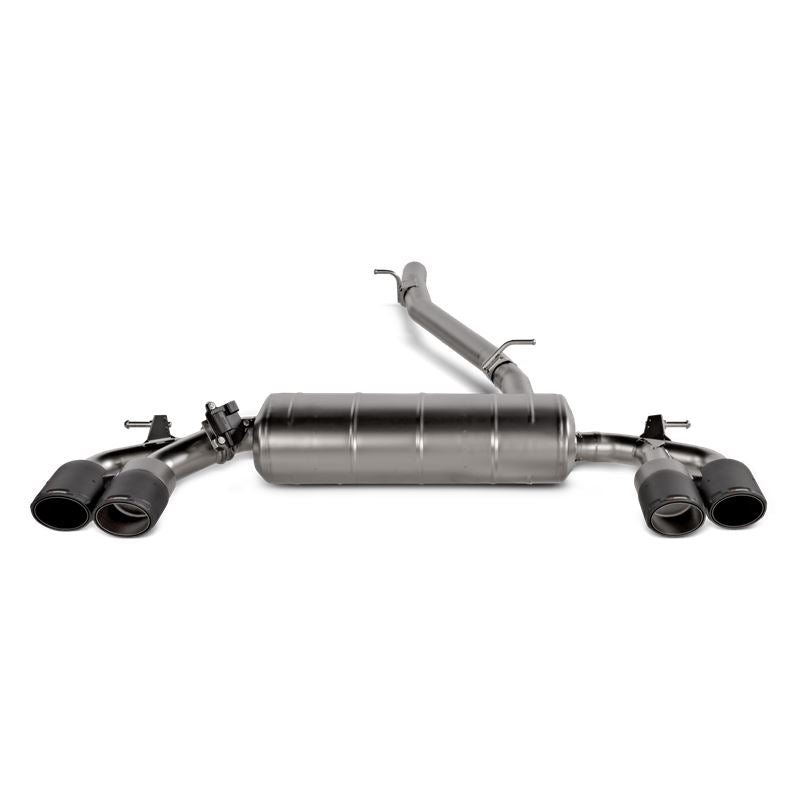 This system is constructed using lightweight race-proven materials, titanium for the muffler and link pipe section, and carbon fibre for two sets of newly designed, hand-crafted tailpipes, delivering a result that is over 41% lighter in comparison to the standard stock system. The Evolution Line (Titanium) has been produced with a valve - which has a housing cast in Akrapovic's own foundry - fitted outside the muffler. This design feature with perfect gas flow allows the sound to be tailored to deliver an Akrapovic aural effect. This creates a smooth, rich sound at normal cruising, with a deep and sporty tone when driving the Audi S3 more dynamically. Power is increased by 4 kW (5.4 hp) at 4,350 rpm, with a torque gain of 8.8 Nm at 3,900 rpm. These figures were measured on the Akrapovic dyno when tested against an Audi S3 with a standard stock exhaust. No remapping is required, giving it a plug-and-play capability, and an optional Akrapovic Sound Kit is also available to offer the driver greater control over the superb tones produced by the system. The exhaust system is ECE type approved for cars equipped with an Otto/gasoline particulate filter.