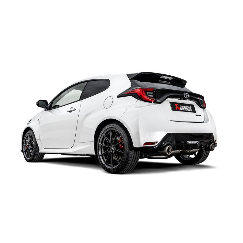 This exhaust is produced using race-proven, high-grade titanium for the entire system and features megaphone-shaped tailpipes. A collector centred between the rear resonators has been cast in the in-house foundry; this collector optimizes and balances the gas flow to produce an acoustically tuned sound with no drone. Three resonators - two at the back of the collector and one in the middle pipe - further tune the sound experience to create a sporty racing tone, fully enhancing the engine's characteristics with a deep and enthusiastic sound, to give the occupants a feeling of exhilaration that is never interrupted by excess noise. The engineers have placed a special emphasis on the acoustics in the middle and high rev range, with a high-frequency tone at higher rpms and more sound at idle and revving. This sound is managed by two megaphone-shaped titanium tailpipes that are welded to the exhaust and specially coated to resist any colour changes at high temperatures. The shape of the tailpipes influences the sound. They are bigger than stock, measuring in at 110 mm, and have a similar profile to the Akrapovic exhaust for the Toyota GR Supra. Developed to decrease back pressure, the system weighs in at 7,8 kg, which is 37 % lighter than stock and yields power gains of 9.5 kW (12.9 hp) at 6,950 rpm and torque increases of 13.0 Nm at 6,950 rpm when tested on the Akrapovic dyno against a Toyota GR Yaris with a standard stock exhaust. This exhaust is designed for use on racetracks and closed courses only. It is necessary to cut the stock exhaust system when installing this product, but no ECU remapping is needed for this configuration. An optional Evolution link pipe is available for customers looking to extend the exhaust tuning possibilities for even better performance of the Akrapovic Slip-On Race Line (Titanium) system. THIS PRODUCT DOES NOT MEET EMISSION COMPLIANCE REQUIREMENTS FOR STREET OR HIGHWAY USE.