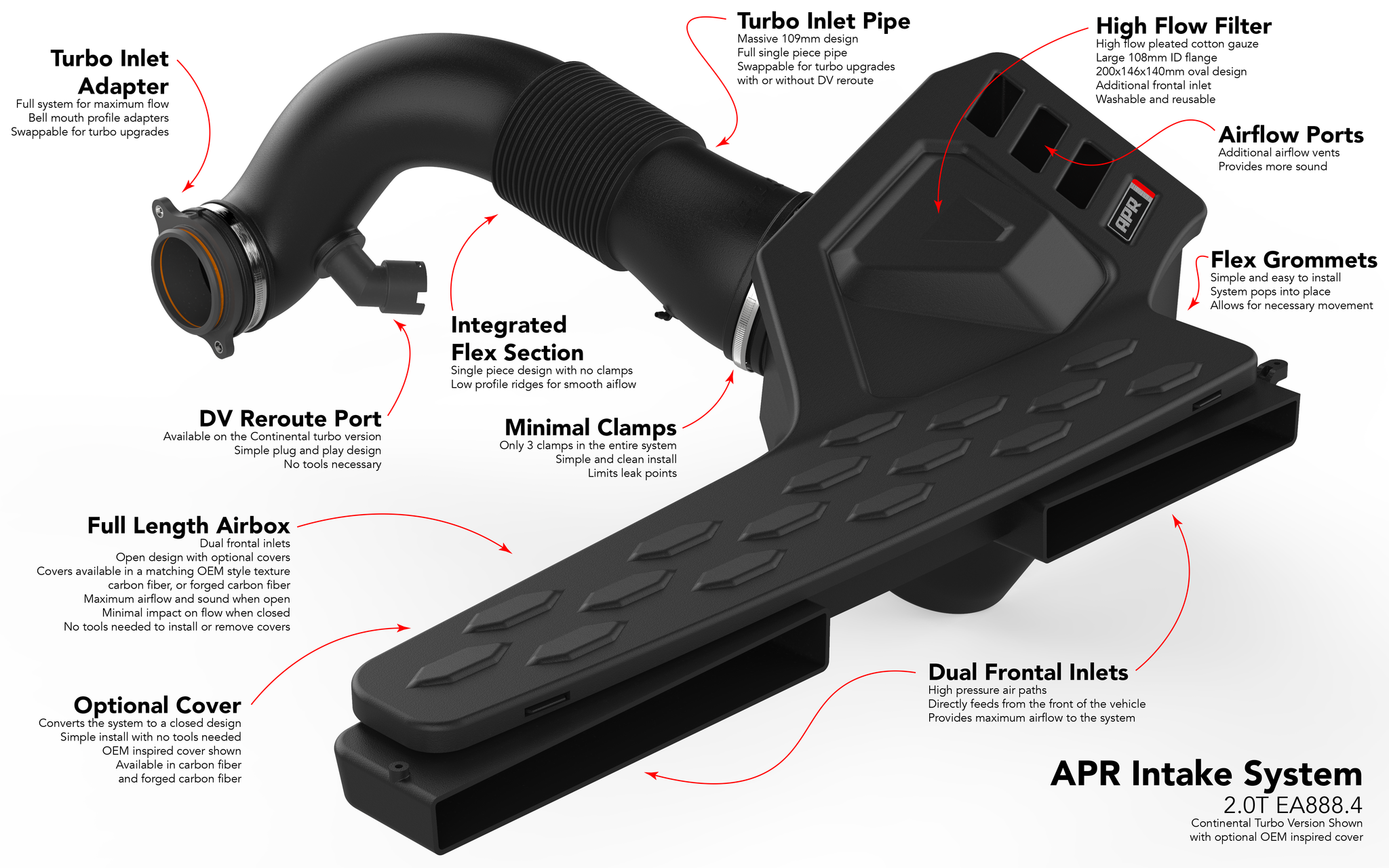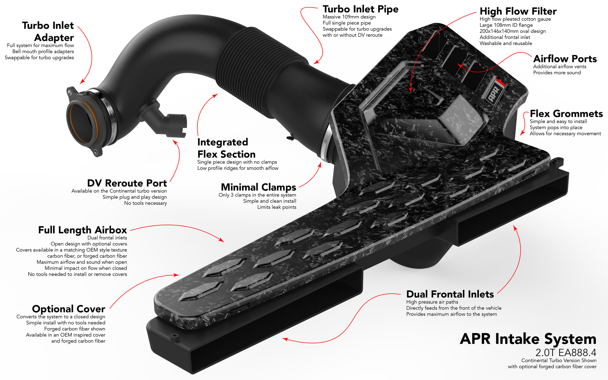 This is the ultimate intake system for the 2.0T EA888.4 Engine. It's a true full 109 mm intake system from the dual frontal inlet scoops all the way to the included turbocharger inlet adapter connecting directly to the turbo. The system is completely configurable making it an open or closed system, both with OEM inspired cover or more stylish carbon fiber covers in both twill and forged carbon fiber. The system is also compatible with stock and larger turbocharger systems, both OEM, hybrid, and aftermarket thanks to swappable back tubes and turbo inlet adapters. The system flows dramatically more than stock, has lower pressure drop, increases horsepower & torque, sounds better, looks better, is completely configurable to your desire, and comes in at a price point that's unbelievably affordable. This is the only intake system you'll ever need!
