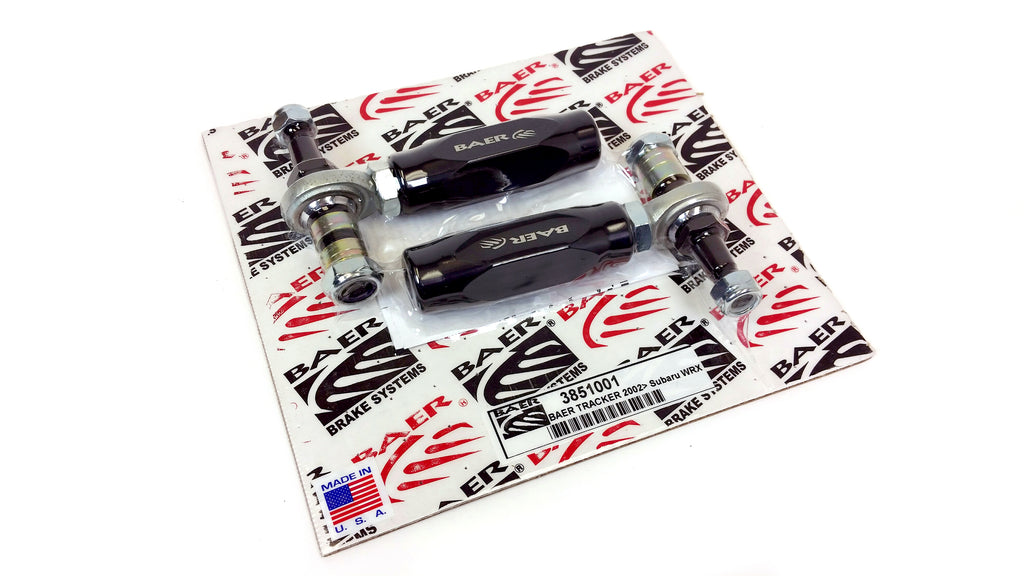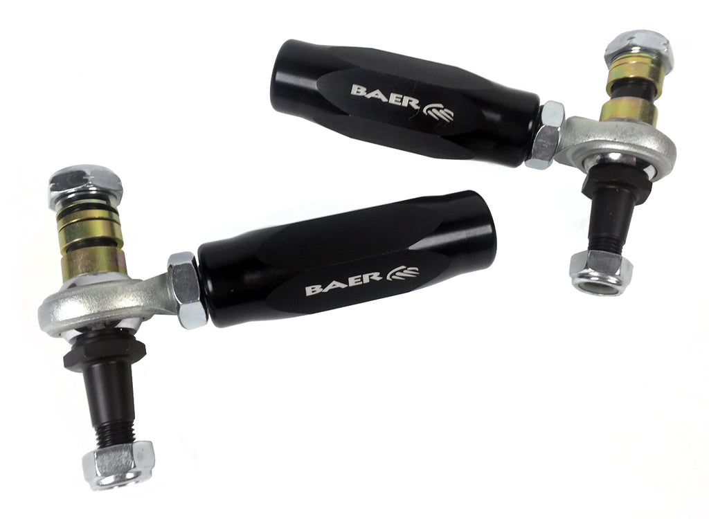The Baer “Tracker” adjustable tie-rods feature 6061 T-6 aluminum, fully machined sleeve with a black anodized finish, a Teflon lined 5/8” heim joint and 4140 steel pin which. The pin is machined with the correct taper so no modification to the OE spindles is required and then heat treated. The Trackers Tie Rods are vehicle specific, mounting to the OE inner tie rod and offer approximately .875” of adjustment at the spindle to help correct bump steer issues due to modified suspensions and/or poor OE design. Best of all these are made in the USA!