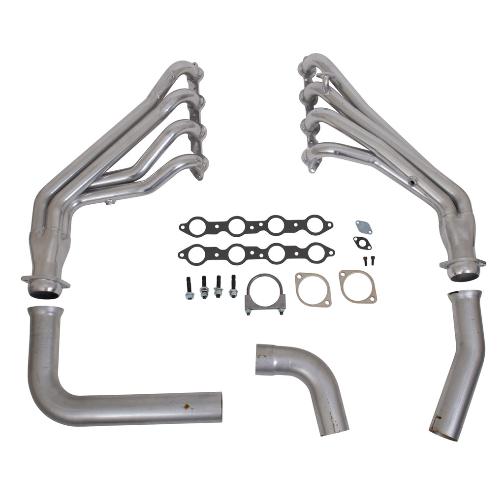 BBK Performance full length long tube exhaust headers offer unsurpassed quality and fitment using top quality materials and American craftsmanship. Every long tube exhaust header system is hand built with CNC mandrel bent tubing for unrestrictive exhaust flow and maximum performance 3/8" laser cut flanges patented scavenging collector design and gasket less ball and socket connectors for easy installation. Every exhaust header has been designed specifically for your application to get the most horsepower and torque out of the engine. BBK long tube exhaust headers outperform the competition in quality value and performance. All headers are a direct fit bolt on replacement when used with the correct matching mid-pipes which are available with high flow catalytic converters. Our decades of exhaust design and experience make BBK Performance your number one choice for late model American car and truck performance exhaust. FITMENT NOTE: Does NOT Fit SUV / Suburban or 2000 Silverado 4.8L Single CAB 2WD Applications Because Of Steering Shaft Clearance.
