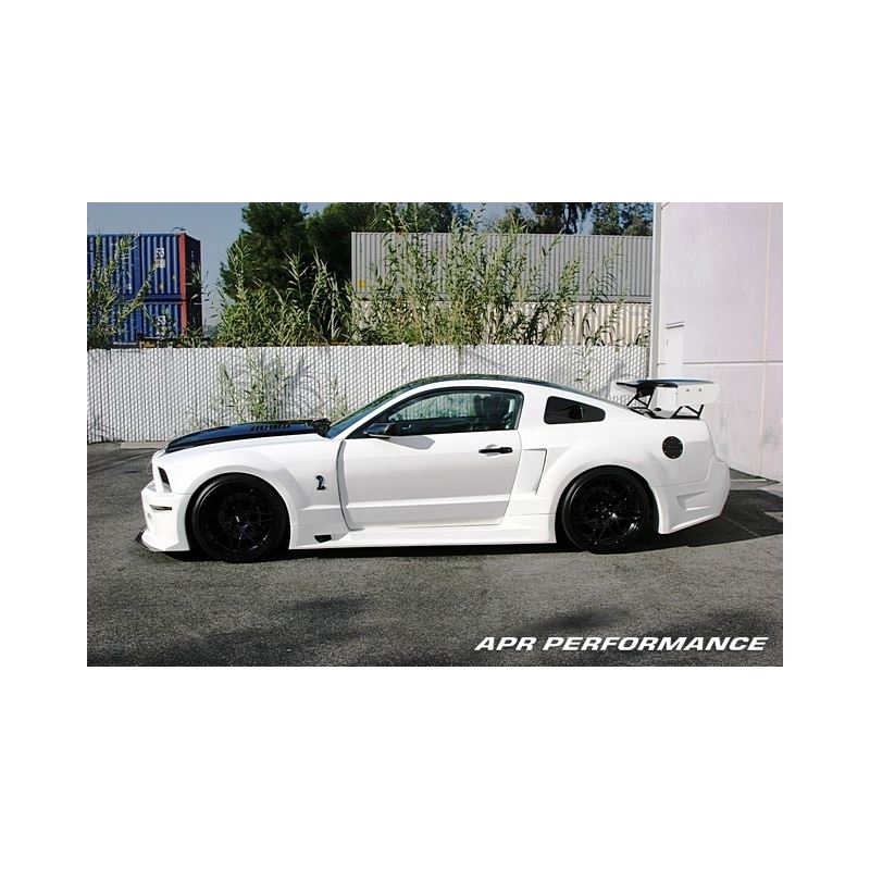 The GT-R Widebody aerodynamic Kit for the S197 Mustang gives an aggressive look while enhancing the smooth and subtle lines. This 10 piece kit helps to improve overall handling and traction. This aerodynamic kit increases the front stance by +45mm per front fender and +50mm per rear fender. It allows installation of massive front wheel sizes of 20"x9.5" with 285/30/20 profile tires and rear wheel sizes of 20"x 12.5" with 345/25/20 profile tires.