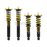 DYNAMIC PRO SPORT coilovers are designed and developed for motoring enthusiasts desiring excellent handling without sacrificing ride comfort. This suspension system features 33-way adjustable dampening settings and full length ride height adjustment to meet every driver’s handling desires. Pillowball mounts and adjustable camber plates are included for front and rear on most kits to increase steering response, while aluminum upper mounts with hardened rubber bushings are used on some applications for noise reduction. This suspension system is ideal for daily driving and occasional track use. Vehicle ride height can be lowered at least 2.5" or more on most application.
