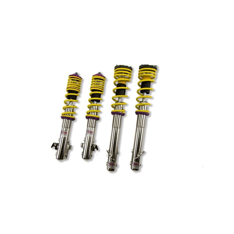 The KW Variant 1 "Inox-line" coilover kit is our entry point into our street performance lineup. Thanks to the high-quality "Inox-line" stainless steel coilover struts, corrosion resistant springs, bumps stops and dampers that are optimally tuned by our engineers the result is a balanced and sporty feel specific to each vehicle application designed for long lasting driving pleasure. The KW Variant 1 "inox-line" coilover allows you to experience an optimized balance of sportiness and comfort while driving. Even with a maximum vehicle load, the dampers always maintain a sporty characteristic. With KW Variant 1 coilovers you can achieve maximum lowering within an approved lowering range that ensures a proper functioning suspension and adequate travel after your car is lowered. Even after years of use you can easily adjust the ride height thanks to the dirt resistant trapezoid thread and composite adjustment collar.