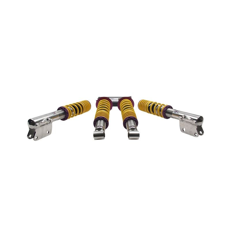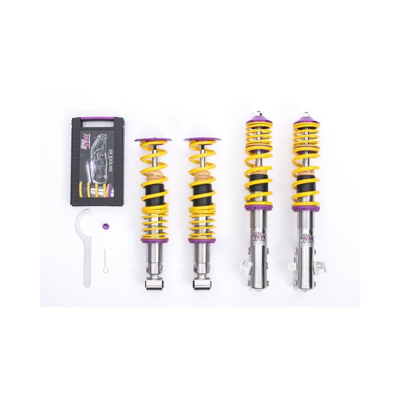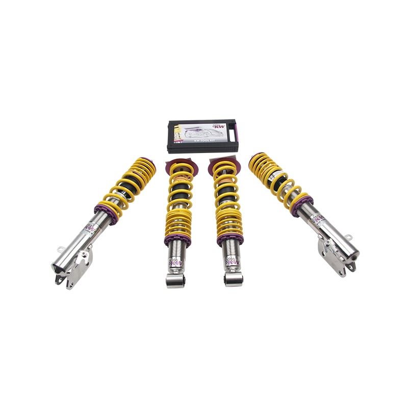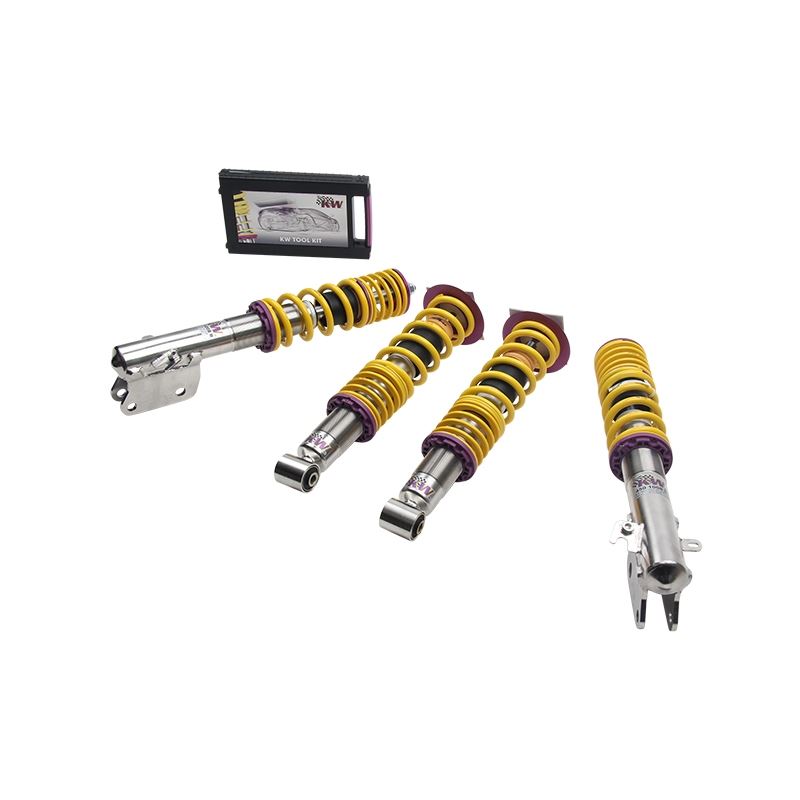 The KW Variant 1 "Inox-line" coilover kit is our entry point into our street performance lineup. Thanks to the high-quality "Inox-line" stainless steel coilover struts, corrosion resistant springs, bumps stops and dampers that are optimally tuned by our engineers the result is a balanced and sporty feel specific to each vehicle application designed for long lasting driving pleasure. The KW Variant 1 "inox-line" coilover allows you to experience an optimized balance of sportiness and comfort while driving. Even with a maximum vehicle load, the dampers always maintain a sporty characteristic. With KW Variant 1 coilovers you can achieve maximum lowering within an approved lowering range that ensures a proper functioning suspension and adequate travel after your car is lowered. Even after years of use you can easily adjust the ride height thanks to the dirt resistant trapezoid thread and composite adjustment collar.