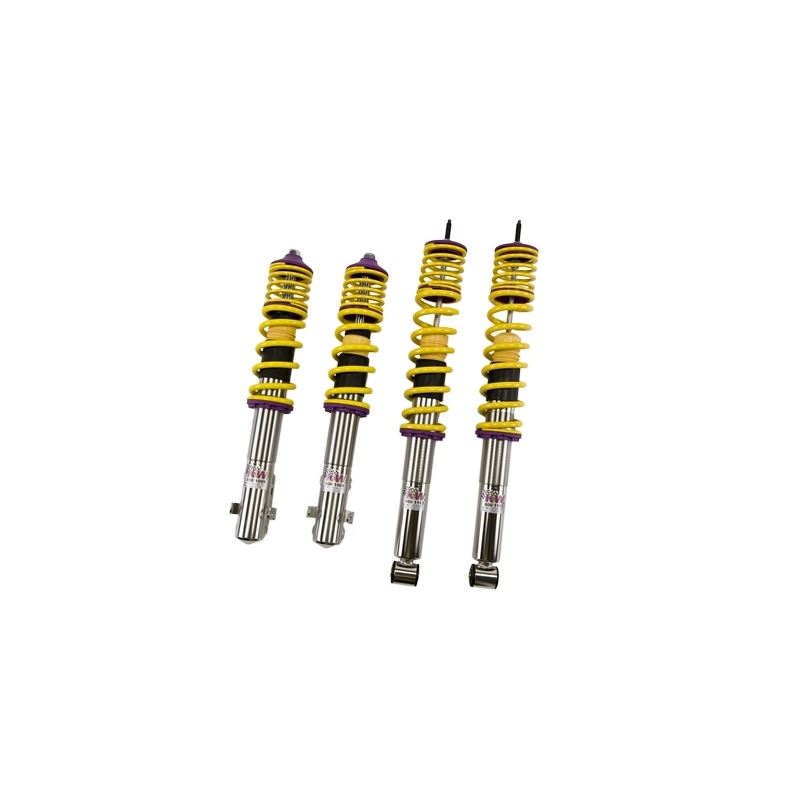 The KW Variant 1 "Inox-line" coilover kit is our entry point into our street performance lineup. Thanks to the high-quality "Inox-line" stainless steel coilover struts, corrosion resistant springs, bumps stops and dampers that are optimally tuned by our engineers the result is a balanced and sporty feel specific to each vehicle application designed for long lasting driving pleasure. The KW Variant 1 "inox-line" coilover allows you to experience an optimized balance of sportiness and comfort while driving. Even with a maximum vehicle load, the dampers always maintain a sporty characteristic. With KW Variant 1 coilovers you can achieve maximum lowering within an approved lowering range that ensures a proper functioning suspension and adequate travel after your car is lowered. Even after years of use you can easily adjust the ride height thanks to the dirt resistant trapezoid thread and composite adjustment collar.