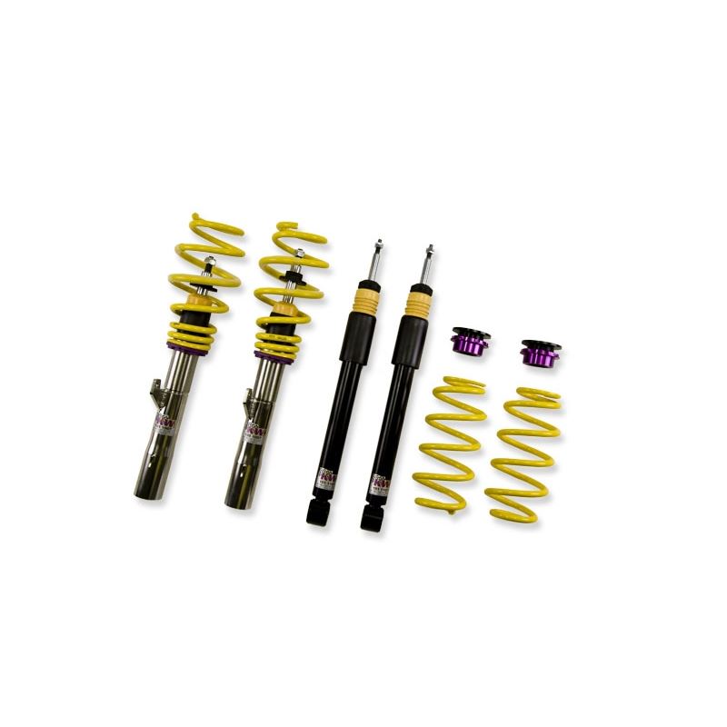 Height adjustable front and rear axles (front axle threaded strut housings, rear axle adjustable springs + dampers). For cars which have electronic dampers, make sure they are shut down. Specific electronical damper shut-downs are available from KW. Please check our accessories list. Only for cars with a clamp diameter of 54,6 mm on the front axle