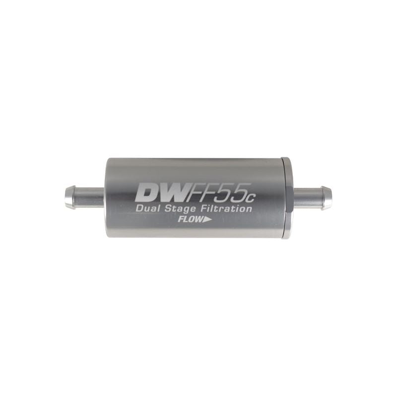 In-line fuel filter element and housing kit, stainless steel 5 micron, 5/16in hose barb, 55mm. Universal