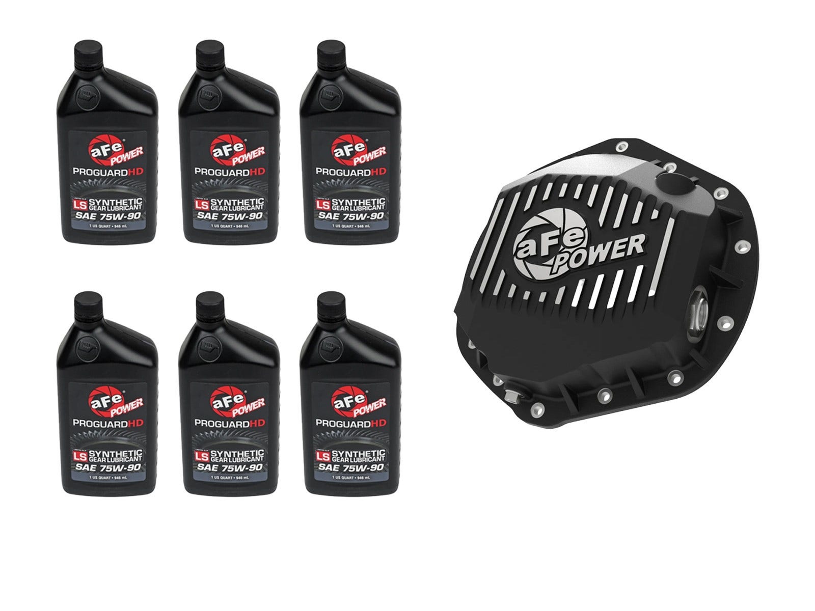 aFe Power's Pro Series front and rear differential covers bring performance-driven protection to your drivetrain. Constructed from durable cast aluminum and designed with reinforced ribs, these covers offer enhanced strength and improved heat dissipation for demanding driving conditions. This is a complete, ready-to-install kit that includes a rear differential cover, all necessary hardware, and 6 quarts of 75W-90 premium PROGUARD Synthetic gear oil —everything you need for a full service in one convenient package. The supplied gear oil exceeds the performance requirements of API GL-5 recommended for both open and limited slip applications. These covers have an increased oil capacity over stock for better performance over a longer duration. Built-in internal and external fins transfer heat from the oil to the outside air for maximum cooling. This system incorporates magnetic drain and deep reach fill plugs to capture loose particles for maximum protection. Each cover uses a calibration plug set to the factory oil level to eliminate overfilling. Each cover includes an oil level sight glass that allows for quick and easy oil inspection.