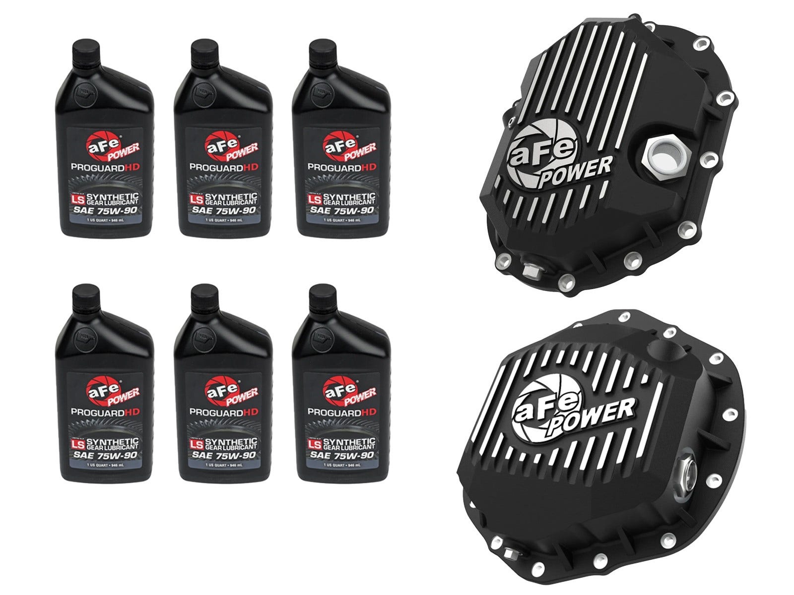 aFe Power's Pro Series front and rear differential covers bring performance-driven protection to your drivetrain. Constructed from durable cast aluminum and designed with reinforced ribs, these covers offer enhanced strength and improved heat dissipation for demanding driving conditions. This is a complete, ready-to-install kit that includes front and rear differential covers, all necessary hardware, and 6 quarts of 75W-90 premium PROGUARD Synthetic gear oil —everything you need for a full service in one convenient package. The supplied gear oil exceeds the performance requirements of API GL-5 recommended for both open and limited slip applications. These covers have an increased oil capacity over stock for better performance over a longer duration. Built-in internal and external fins transfer heat from the oil to the outside air for maximum cooling. This system incorporates magnetic drain and deep reach fill plugs to capture loose particles for maximum protection. Each cover uses a calibration plug set to the factory oil level to eliminate overfilling. Each cover includes an oil level sight glass that allows for quick and easy oil inspection.