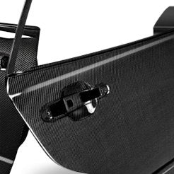 Although they're made for off-road/racing use, our custom doors are faithful reproductions of the heavy OE panels crafted in carbon fiber and fiberglass that is much lighter yet exhibits exceptional stiffness for high strength. And although these products will help your vehicle shed weight, you don't have to sacrifice any style in the process. To the contrary, each carbon fiber panel has a glossy finish that allows that unmistakable track-ready carbon fiber pattern to show through, and fiberglass panels come ready for prep and paint.