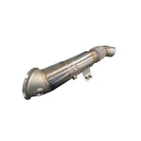 Our F90 M5 downpipes are manufactured in house using 304 stainless steel. Each set is meticulously tig welded and checked for perfect fitment. Our design uses a factory matched 3.5" v-band inlet that tapers to a high flowing, mandrel bent" body and includes the lower section sold by others as a "mid-pipe".