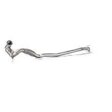 The high-flow downpipe with front link pipe is constructed using high-quality stainless steel and once fitted to Golf R / Audi S3 equipped with either standard or Akrapovi? performance exhaust system, it further enhances the performance figures: both the torque and power outputs. It incorporates a catalytic converter (200 cpsi) which is ECE-compliant. This optional downpipe produces an enhanced sound that delivers a pure racing emotion and fantastic feedback at high revs, without unwanted drone, making it suitable for everyday use.