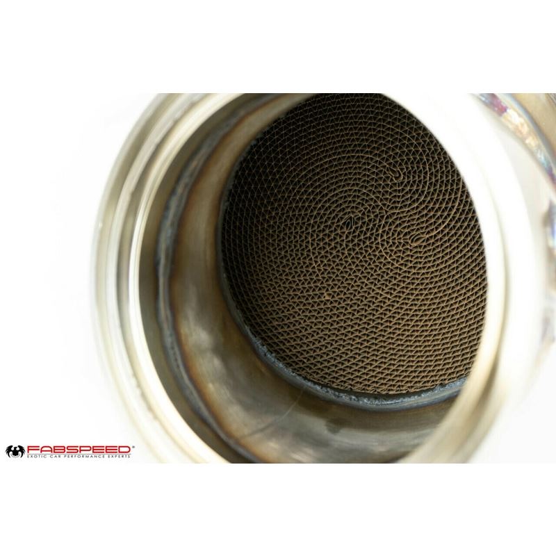 HJS German imported catalytic substrate cores are made by EMITEC utilizing the highest grade stainless steel materials and Tri-metallic precious metal wash coats for high performance street and racing competition usage. HJS German 200 cell Trimetallic Euro 6 HE catalytic converters give the highest performance gains, improved sports car sound and maximum durability. Other brands of catalytic converters immediately deteriorate and fail over time as is typical. Some other companies and brands DO NOT even offer catalytic converters as they know that their catalytic converters will NOT work even when 100% brand new as they have no reliable quality solutions. The HJS German imported HD catalytic converters flow up to 90-92% of a straight pipe in most applications. The benefit is that you get the "straight pipe sound" while still being able to provide enough emissions scrubbing to prevent a check engine light. Typically no P420 and no P430 codes and your car smells clean with no need for a tune to pass emissions testing. It's a win win solution for a sportier sound, more power, and a cleaner running car which prevents pollution. Not all HJS catalytic converters are the same. Size matters and directly correlated to power, sound, and durability. Fabspeed utilizes the LARGEST possible HJS Catalytic converter for maximum power and sports car sound. No short cuts ever.