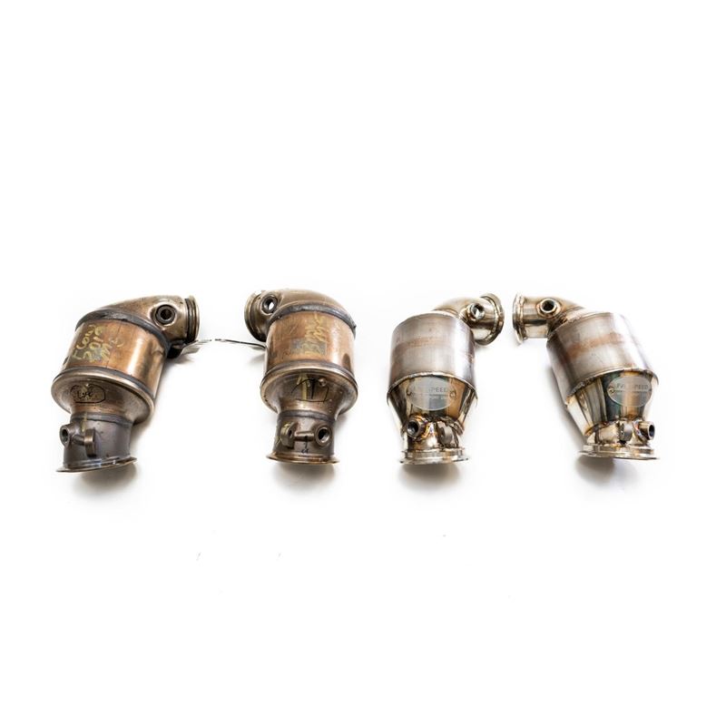 - Direct replacement bolt-on complete German catalytic converter assemblies for the stock OEM restrictive catalytic converters