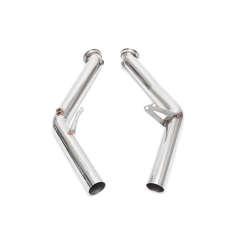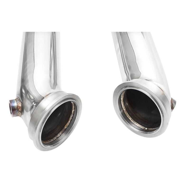 Maximum performance catless downpipes replace the restrictive primary factory catalysts with straight-through mandrel-bent tubing sections for maximum performance and exhaust sound.