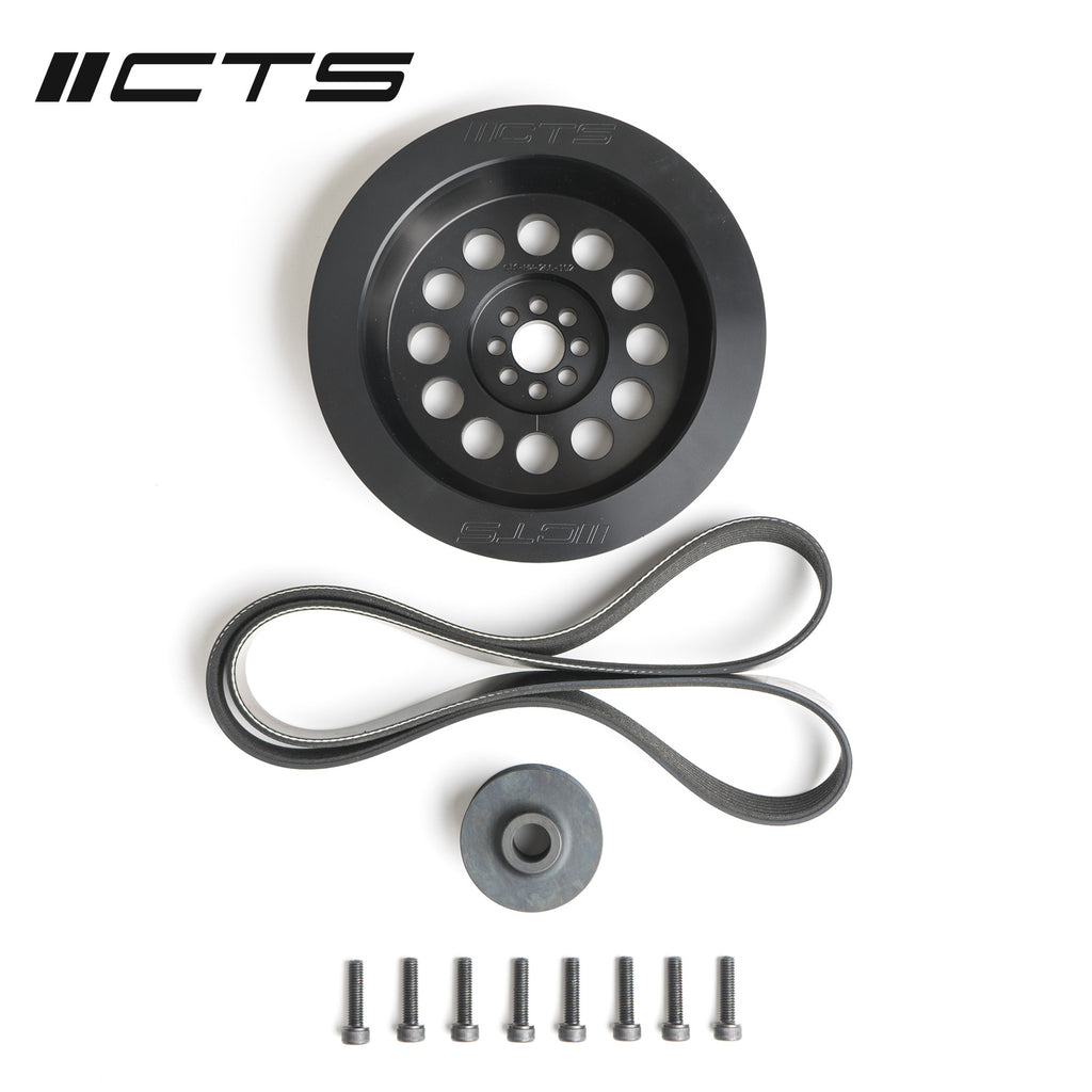 CTS Turbo is proud to release our 180mm Dual Pulley Upgrade Kit for Supercharged 3.0T V6 engines (press-on style). The smaller diameter supercharger pulley and larger diameter crank pulley will increase the speed at which the supercharger spins and will increase the boost pressure output. Increased boost pressure in conjunction with upgraded ECU software results in a dramatic increase in horsepower and torque throughout the entire powerband. This will not drastically increase stress or excessive wear on supercharger or engine components. This kit features press-on style supercharger pulley. Check on your vehicle before ordering! NOTE: This kit must be used with appropriate "Stage 2+" or equivalent performance software. Please contact your tuner. Use of upgraded heat exchanger is highly recommended.