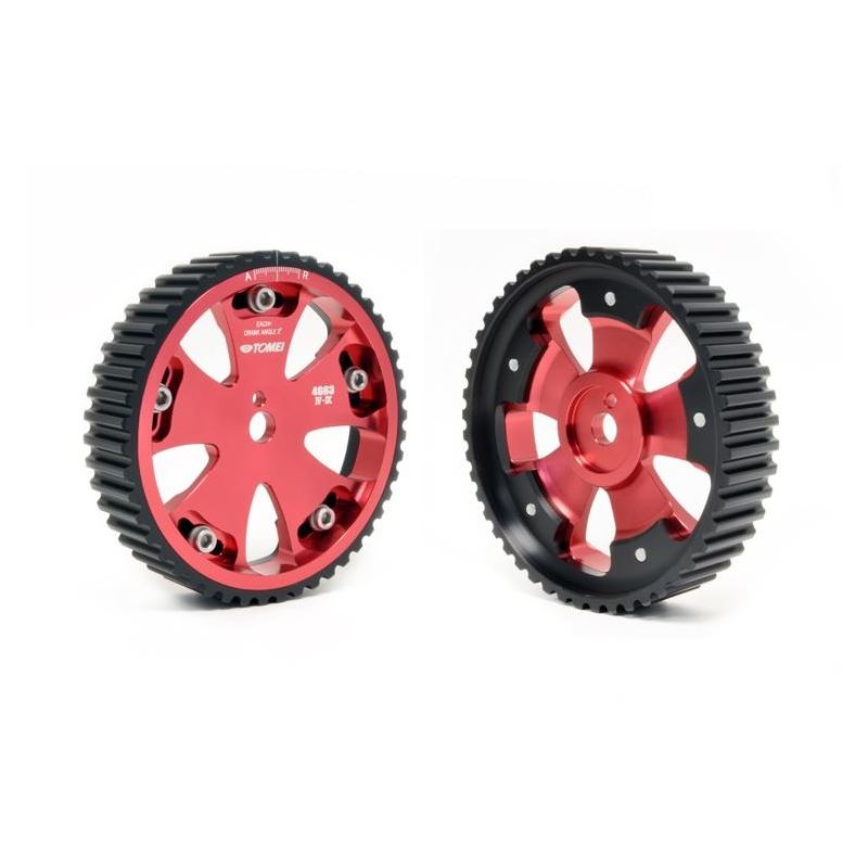 The Tomei adjustable cam gear is adjustable for those of you who want to advance timing to their liking. It is made of Super Lightweight Duralumin.Duralumin was chosen for its lightweight properties and extra strength and durability. Both the outer and inner part is made from Duralumin to ensure that the product is the strongest available on the market. The pulley and inner plate are made from billet aluminum. The pulley gear part has been designed and manufactured from precision methods to guarantee reliability with securing the drive from the timing belt.The Intake and Exhaust cam pulley have been designed and manufactured individually so as when the pulley comes to the top it is easier to adjust the timing from TDC(model specific). The hard anodized surface coating greatly increases the durability of the pulley. The added strength will allow the pulley to guarantee reliability for drag racing cars that are running monster power engines that exceed 1,000 HP and used with engine speeds in excess of 10,000 RPM. The Duralumin material with the hard anodized surface treatment gives it better operational reliability and will enhance the look of your engine bay for that showroom finish. A simple scale was designed to help aid tuners anywhere are able to setup the settings on the scale to aid with easy setup process.