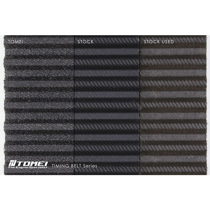 The Tomei Engine Belts are made using premium grade materials with high resistance to heat, stretch and engine fluids, which significantly increase the longevity of these belts. The belt teeth are made using a specially formulated fiber-infused rubber compound and a wear-resistant low friction cover fabric. These materials are an upgrade over traditional OEM counterparts, increasing belt longevity whilst also reducing operating noise. Strong glass fiber cords of high tensile strength are used to reinforce the belt, helping to minimize belt stretch even under high/heavy loads. The low-friction, crack resistant blue top layer also helps prolong the life span of the belt.