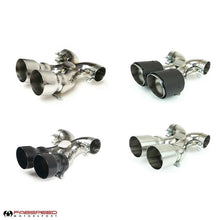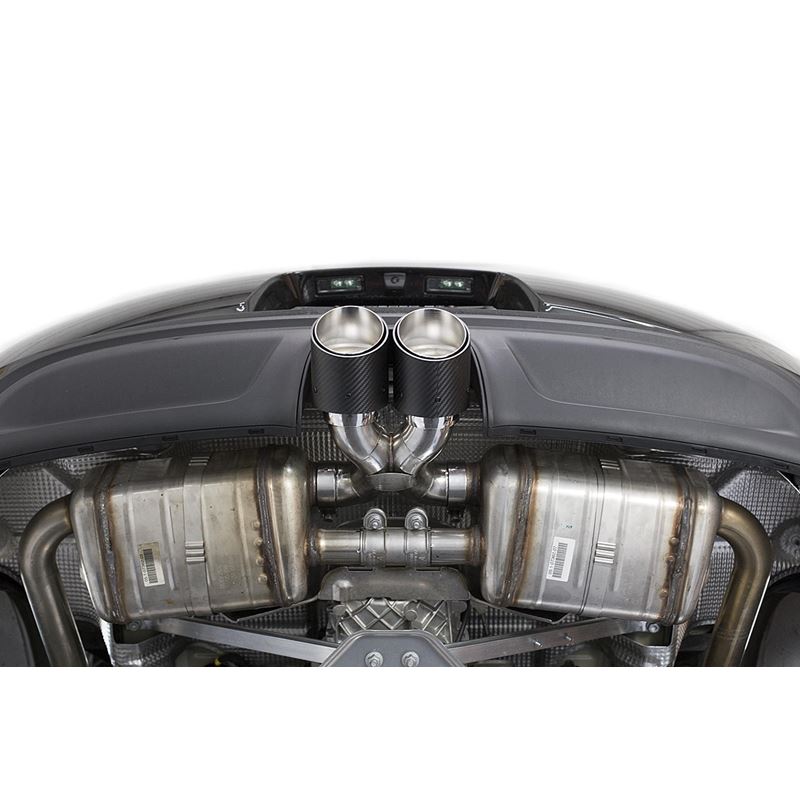 The factory Porsche AG OEM exhaust tip design sends exhaust gasses directly at each other from each end of the muffler. The exhaust pulses therefore slam into each other and then as pressure builds the exhaust is forced through a harsh 90 degree turn out to exit through the tips. Fabspeed's premium Maxflo X-pipe with dual tips is actually the world's only true X-pipe design. This allows exhaust gases to more efficiently exit the factory mufflers - increasing velocity and smoothing out sound resulting in a solid increase in power and exhaust volume. Equally appealing is the added aesthetic enhancement that our sporty exhaust tips offer and the finish is yours to choose from 4 tip finishes.