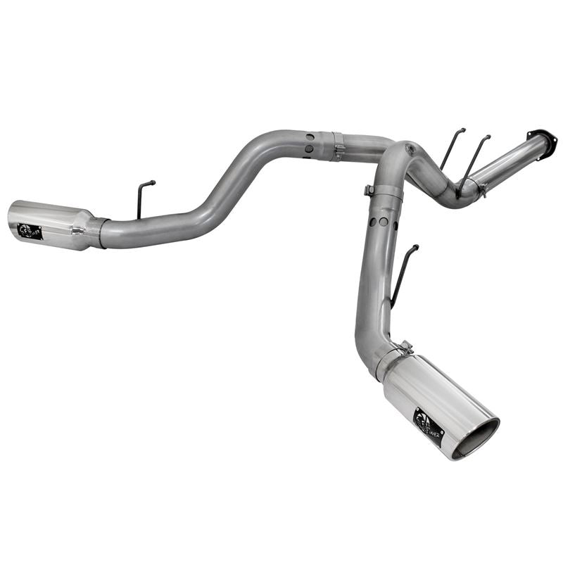 This DPF-back exhaust system is constructed of 4 IN mandrel-bent 409 stainless steel tubing for maximum strength and durability. Finishing off this exhaust system are dual 6 IN diameter polished 304 stainless steel clamp-on exhaust tips. The tips features an aFe POWER logo plate riveted on for a unique style. Utilizing a factory style flange and hangers this system is a direct bolt-on system, which requires no cutting or modifications for a hassle-free installation. A true mitered merge is used to decrease turbulence and increase exhaust velocity resulting in increased horsepower, torque and improved throttle response. This system is designed with Intercooling tailpipes, to reduce exhaust gas temperatures at the tailpipe. 100% MIG-Welded for race-proven strength and durability.