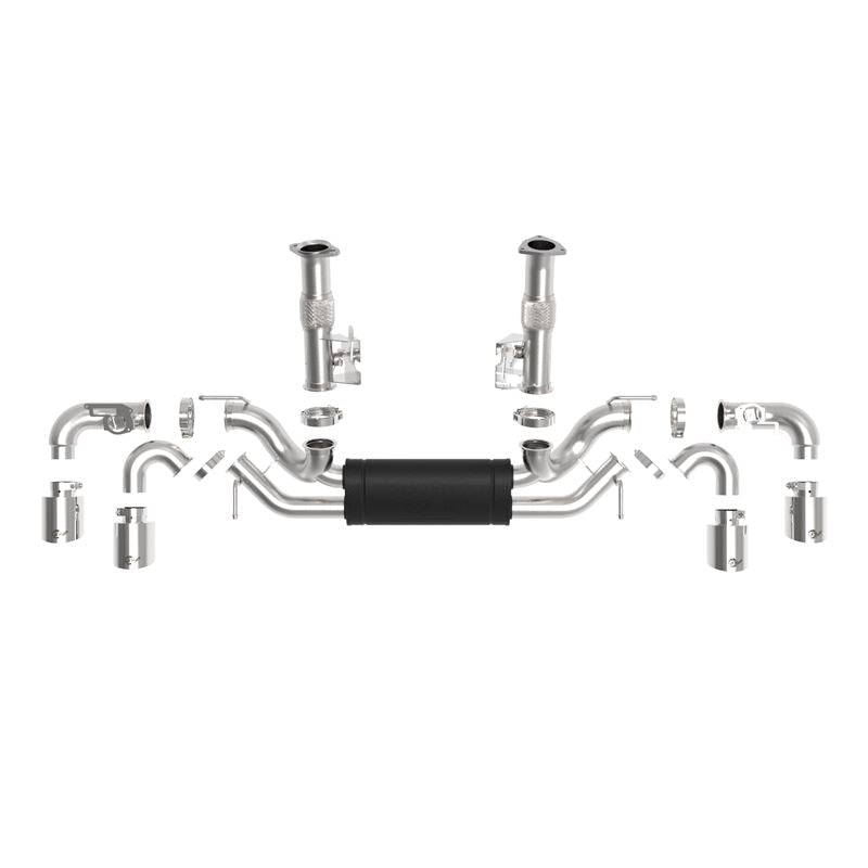This system produced gains of up to +9 HP and +10 lbs. x Ft. TQ., as measured on our in-house dyno. This cat-back exhaust system is constructed of 3" - 2-1/2" mandrel-bent brushed finished 304 stainless steel tubing for maximum strength and durability. This system features a high-flow high-temperature metallic black muffler, producing a powerful sound. The muffler has a high-temperature metallic black finish for ultimate corrosion resistance. Finishing off this exhaust system are quad 4-1/2" diameter polished stainless steel clamp-on exhaust tips. The tips feature a laser etched aFe POWER logo for a unique style. This system produces a powerful sound unleashing all available horsepower and torque. Utilizing factory style flanges and hangers this system is a direct bolt-on system, which requires no cutting or modifications for a hassle-free installation. This cat-back exhaust system uses a heavy duty flex pipe with an internal interlock liner for added strength and durability. The aFe Muffler features an integrated x-pipe to balance and evenly distribute exhaust pulses traveling through the exhaust system, minimizing exhaust drone and maximizing scavenging. This axle-back exhaust system incorporates factory style NPP dual mode andamp; AFM (active fuel management) exhaust valves which use the factory exhaust valve motors (not included). The valves helps regulate, direct and control the flow of exhaust gases by opening, closing, or partially obstructing passageways depending on throttle position for maximum performance. Utilizing state-of-the-art computer-aided design technology, this exhaust system is designed for custom, high tolerance factory fitment. 100% TIG-Welded for race-proven strength and durability.