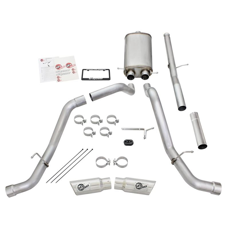 Mach Force XP 409 SS Cat-Back Exhaust System with Split Side Exit (49-44057-P) by aFe. Exhaust System Type: Cat-Back. Exhaust Tubing Material: 409 SS. Main Tubing Diameter: 3". Exhaust System Sound: Aggressive / Loud. Get increased exhaust flow, more horsepower and torque, improved performance and lower exhaust gas temperatures with the aFe Mach Force XP Cat-Back Exhaust System. aFe dyno tests every system for maximum gains, and constructs them from mandrel-bent stainless steel for maximum flow and long-lasting durability. This system begins at the Cat (Catalytic Converter).