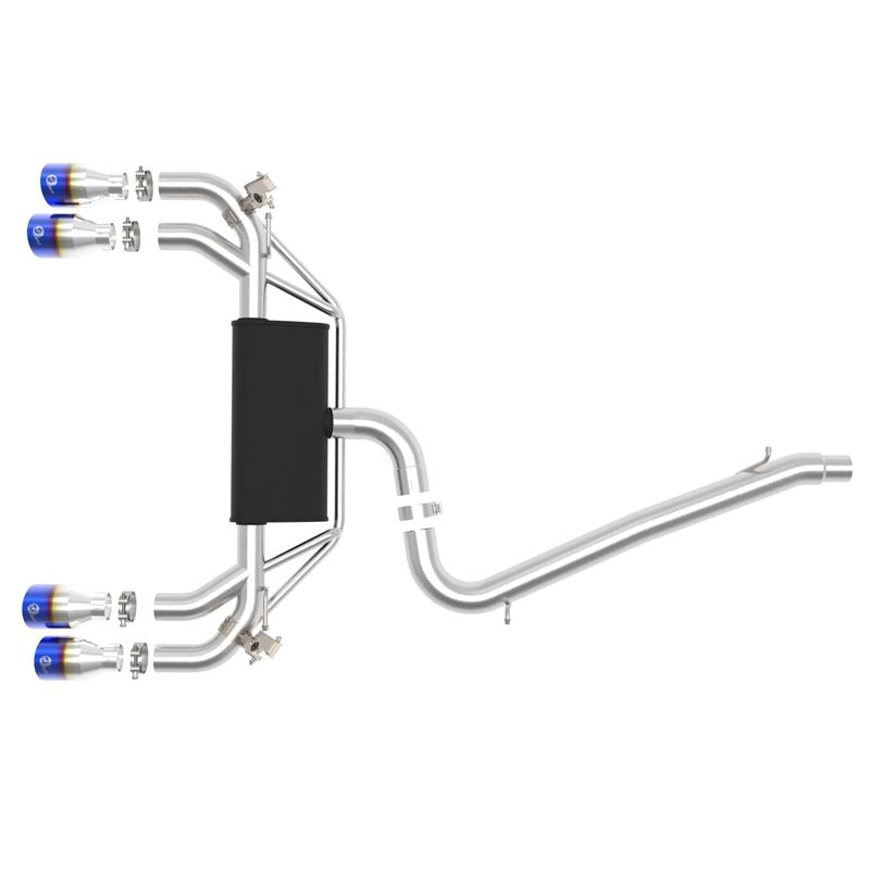 This cat-back exhaust system is constructed of 3 IN - 2-1/2 IN mandrel-bent brushed finished 304 stainless steel tubing for maximum strength and durability. This system features a stainless steel black muffler, producing a deep sound. The muffler has a black finish for ultimate corrosion resistance. The dual muffler bypass tubes are incorporated into the system to optimize sound tuning. Finishing off this exhaust system are quad 4 IN diameter blue flame 304 stainless steel clamp-on exhaust tips. The tips features a laser etched aFe POWER logo for a unique style. This system produces a deep sound unleashing all available horsepower and torque. Utilizing factory style hangers this system is a direct bolt-on system, which requires no cutting or modifications for a hassle-free installation. This cat-back exhaust system incorporates factory style exhaust valves which use the factory exhaust valve motors (not included). The valves help regulate, direct and control the flow of exhaust gases by opening, closing, or partially obstructing passageways depending on throttle position for maximum performance. Utilizing state-of-the-art computer-aided design technology, this exhaust system is designed for custom, high tolerance factory fitment. 100% TIG-Welded for race-proven strength and durability.