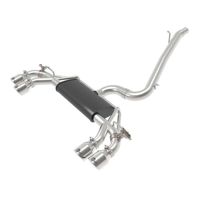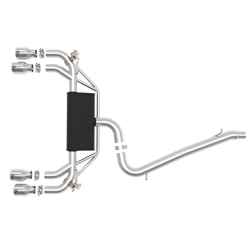 This cat-back exhaust system is constructed of 3 IN - 2-1/2 IN mandrel-bent brushed finished 304 stainless steel tubing for maximum strength and durability. This system features a stainless steel black muffler, producing a deep sound. The muffler has a black finish for ultimate corrosion resistance. The dual muffler bypass tubes are incorporated into the system to optimize sound tuning. Finishing off this exhaust system are quad 4 IN diameter polished 304 stainless steel clamp-on exhaust tips. The tips features a laser etched aFe POWER logo for a unique style. This system produces a deep sound unleashing all available horsepower and torque. Utilizing factory style hangers this system is a direct bolt-on system, which requires no cutting or modifications for a hassle-free installation. This cat-back exhaust system incorporates factory style exhaust valves which use the factory exhaust valve motors (not included). The valves help regulate, direct and control the flow of exhaust gases by opening, closing, or partially obstructing passageways depending on throttle position for maximum performance. Utilizing state-of-the-art computer-aided design technology, this exhaust system is designed for custom, high tolerance factory fitment. 100% TIG-Welded for race-proven strength and durability.