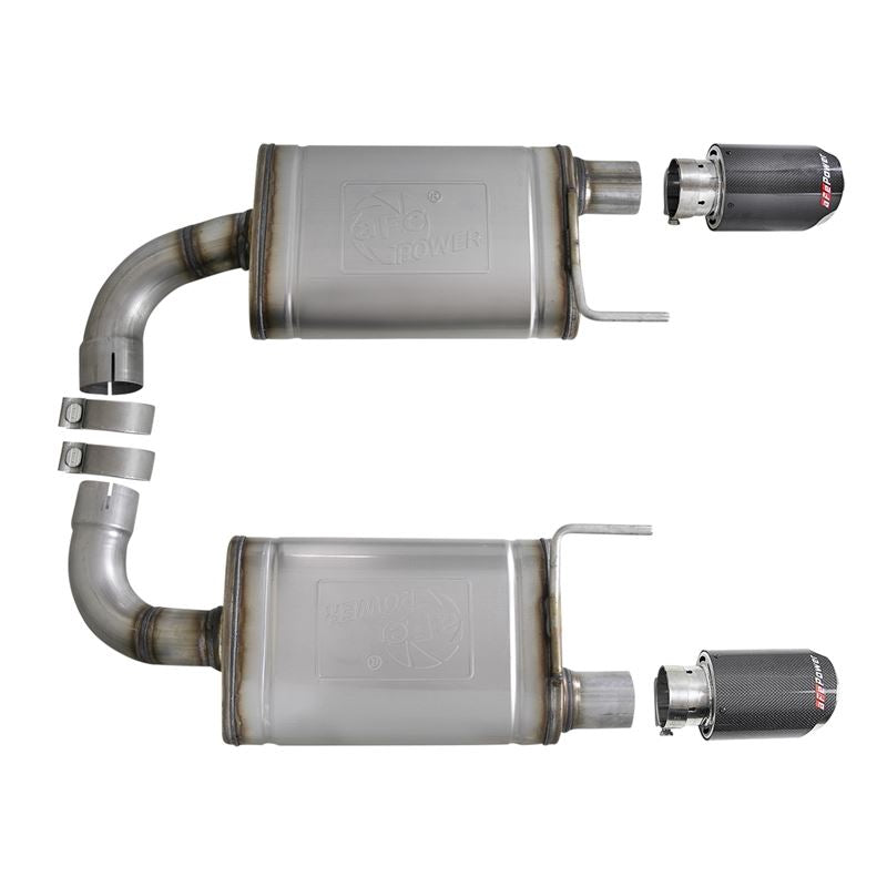 Add sound and style to your Mustang GT with this MACH Force-Xp axle-back exhaust system. Mandrel bent 409 stainless steel tubing and dual high-flow mufflers improve exhaust flow to deliver an aggressive sound. Dual 4" Carbon fiber 304 stainless steel tips with laser etched aFe POWER logo complete the look of your S550. This system requires cutting and removing the factory muffler assemblies.